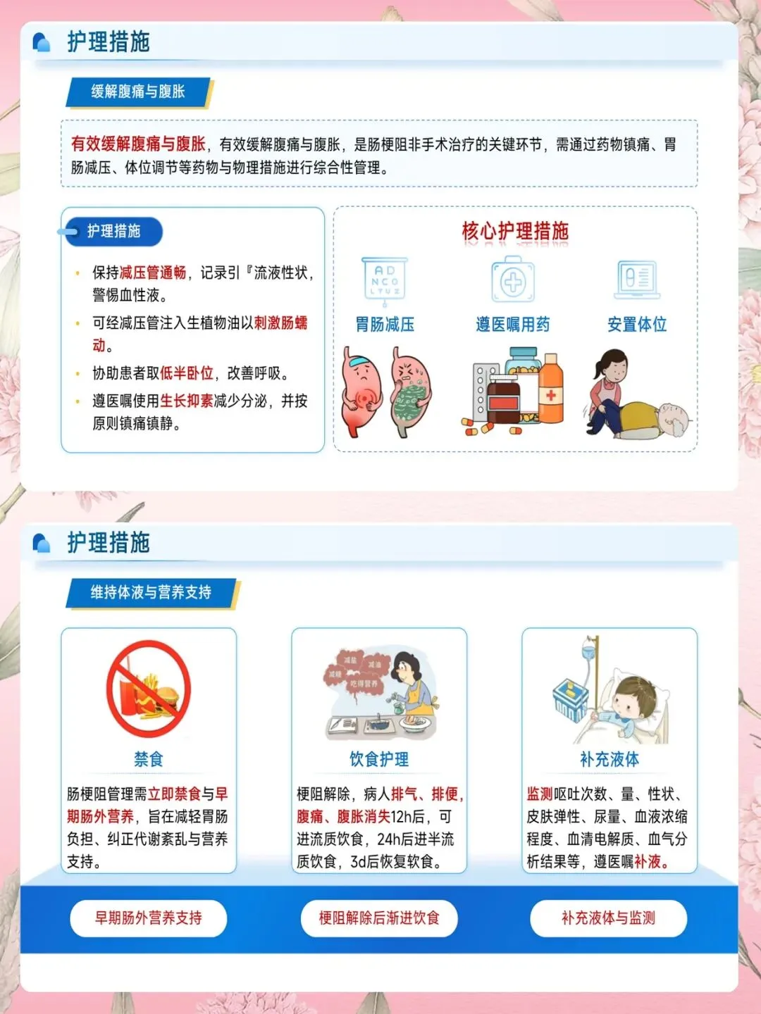 护士在护理中要抓住核心措施:禁食、胃肠减压、补液、早期肠外营养。尤其是胃肠减压,保持通畅、记录引流液性状,警惕血性液体。梗阻解除后,排气、排便恢复12小时,才可进流质;24小时后半流质;3天后软食。