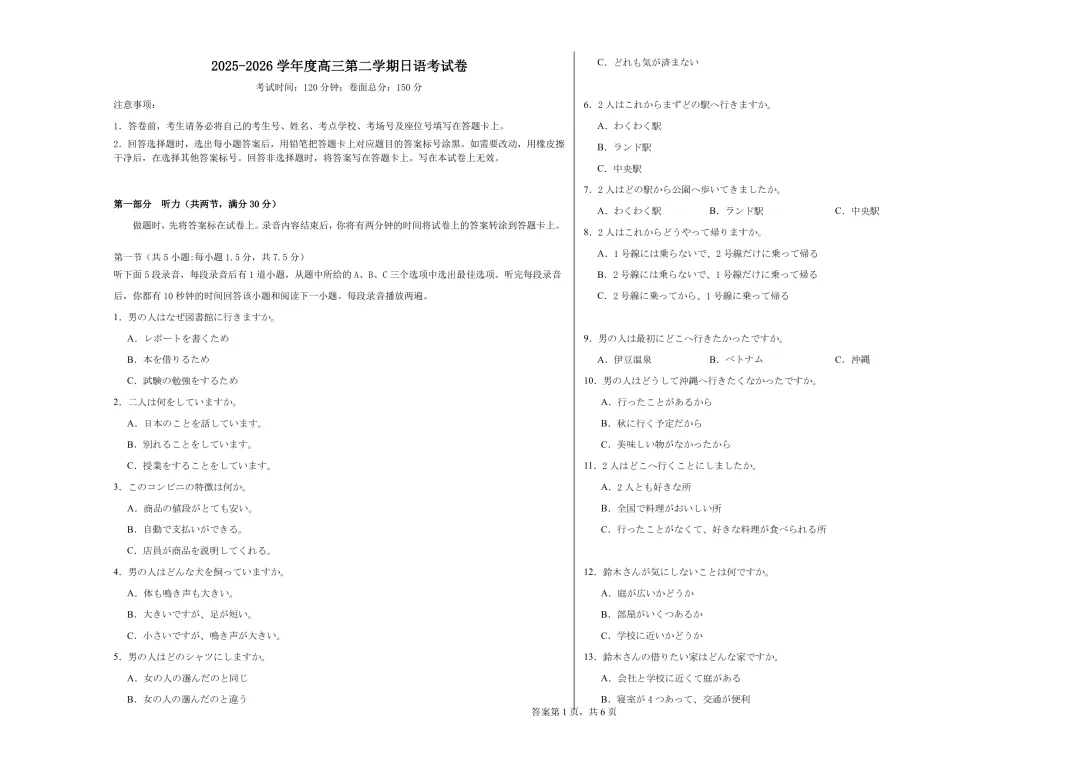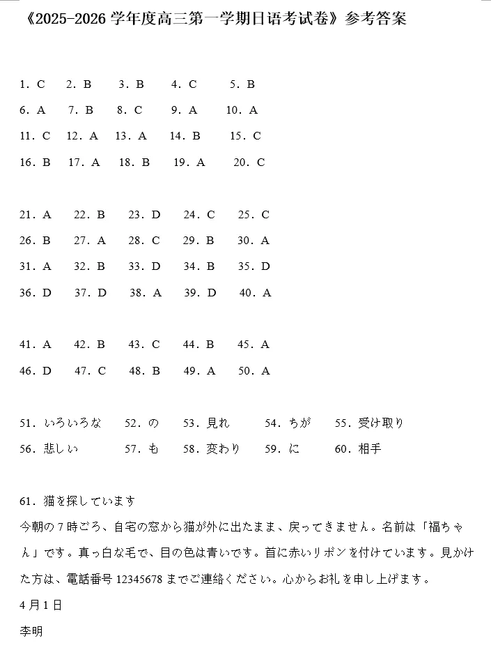 江西赣州市十八县二十四校联考2026届高三下学期四月期中联考日语试卷