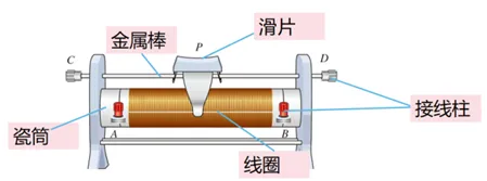 (1)构造:滑动变阻器的构造如图所示:接线柱A、B之间时滑动变阻器的电阻丝;接线柱C、D之间是金属杆,电阻为零;P是金属滑片,与金属杆和电阻丝相连(电阻丝的表面涂有绝缘漆,但与滑片接触的地方绝缘漆被刮掉),滑片本身看作电阻为零。滑片移动到不同位置时,接入电路的A、C(D)或B、C(D)两个接线柱间电阻丝的长度不一样,这样就改变了接入电路中电阻的大小。
