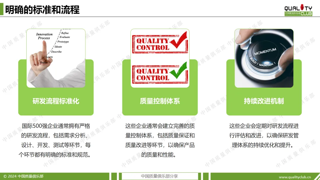 国际500强企业在研发质量管理方面通常采用一系列成熟的方法和体系,以确保研发活动的高效率和产品的质量。这些方法和措施包括建立研发管理体系、跨职能团队合作、多流程并行运作、科层集中研发组织模式、质量战略规划与执行、源流管理和系统管理、持续改进和创新、科学的研发方法、风险管理、用户需求导向、质量控制工具的应用以及绩效评估与反馈等。