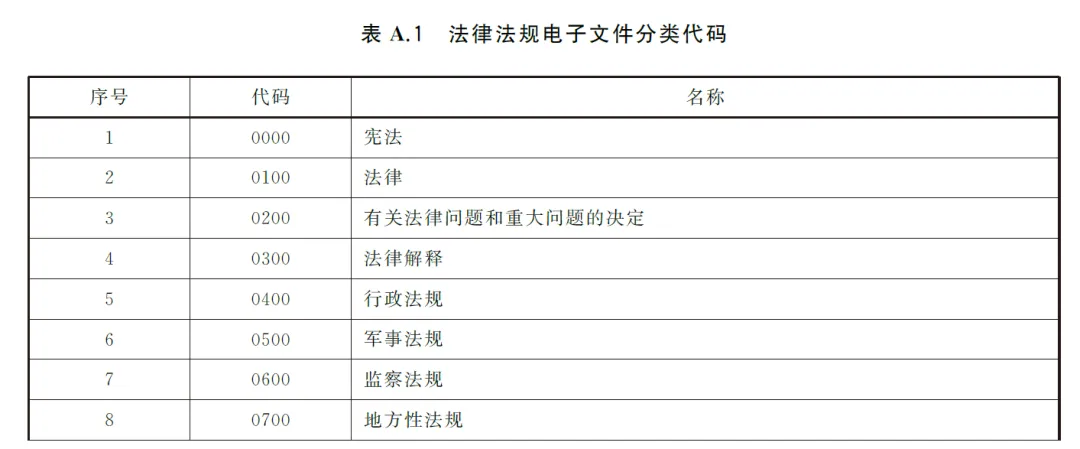 新标准还同时提供了电子文件分类代码,主要是按制定的主体来划分的,不同于法律部门的分数。它主要包括:宪法、法律、有关法律问题和重大问题的决定法律解释、行政法规、军事法规、监察法规、地方性法规,共8个类别,其中第3项“有关法律问题和重大问题的决定”有点特殊,根据《立法法》第六十八条规定“全国人民代表大会及其常务委员会作出有关法律问题的决定,适用本法的有关规定。”