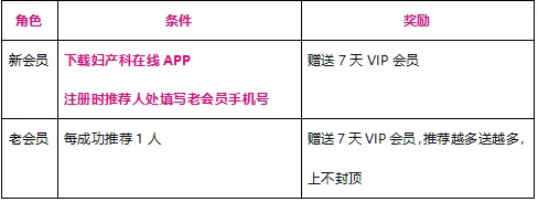 1、老带新活动:新会员下载妇产科在线APP,注册时填写推荐人手机号即可。