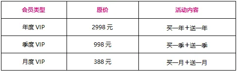 活动期间购买任意会员,买一年送一年,买一季送一季,买一月送一月。