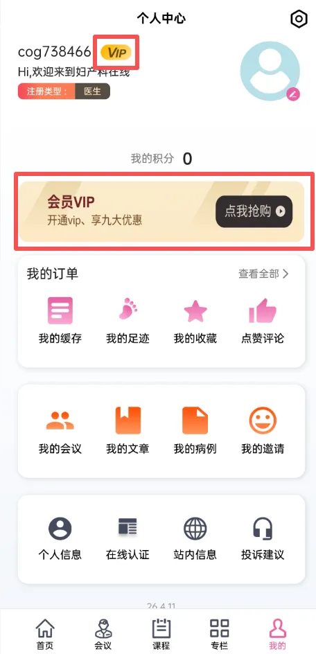5月7日会员奖励发放后,可收到短信通知提醒;也可通过妇产科在线APP--我的--个人中心查看是否有VIP标识,点击“会员VIP”广告条可查看会员有效期。