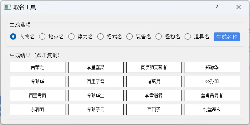 这个软件有一个我最爱的功能,就是它能帮你取名,我在写小说的时候最头疼的就是这个地名人名该怎么取,而这个软件很好的解决了这个问题。它里面有【取名工具】,它可以给你自动生成这些你想到头秃的名称,只要选择生成的选项后,再点【生成名称】就完成了名称的生成。