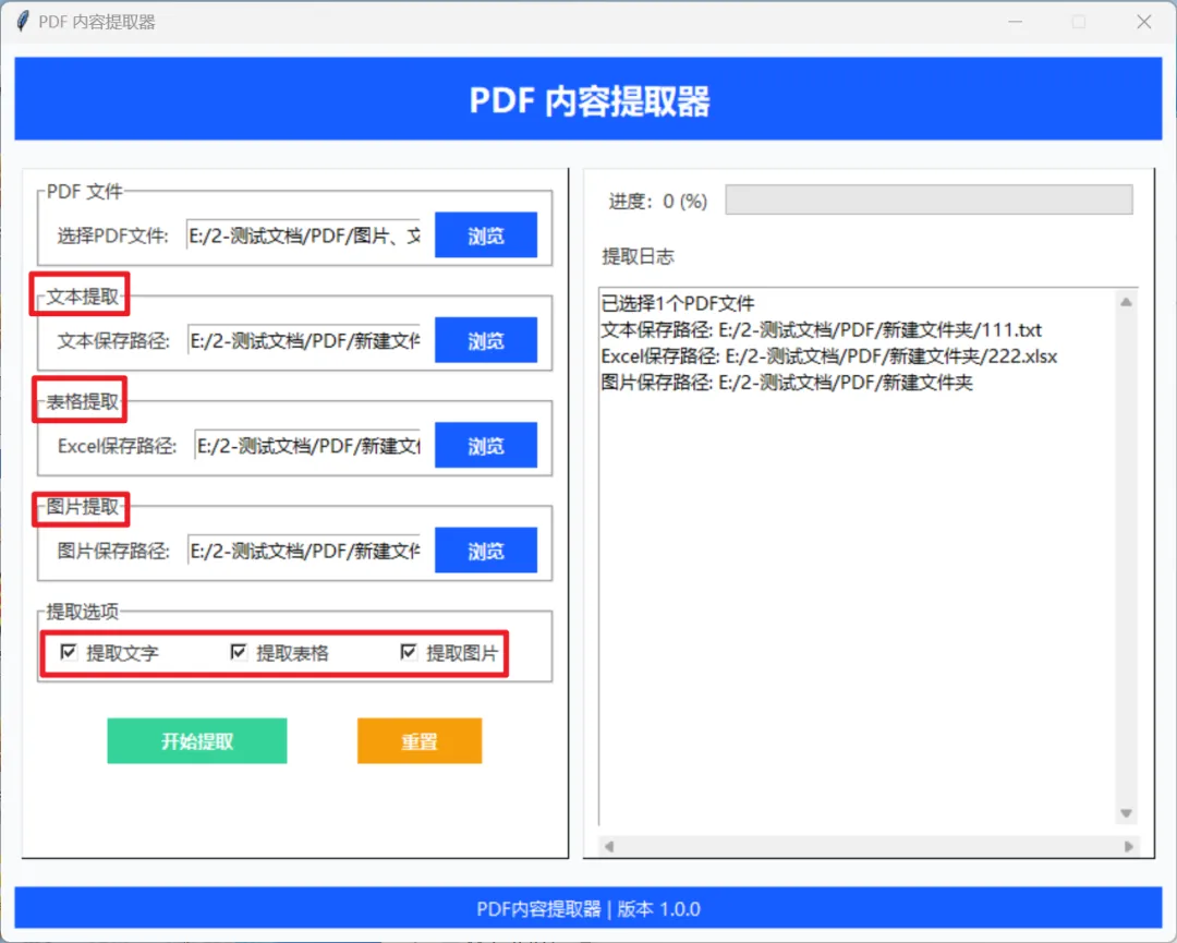 在这个软件上,你只要选择想要提取的PDF文件,设置好提取后文本、表格、图片的存放位置,最后点击【开始提取】就可以把文本、图片和表格提取到相对应的位置啦。