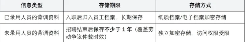 1.个人信息存储于中国境内,存储期限为招聘结束后不少于1年(以覆盖劳动争议仲裁时效)。