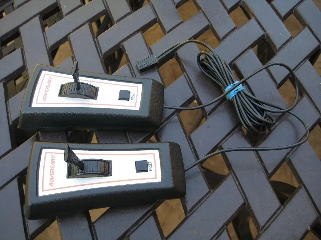 随计算机附带的最早期的游戏手柄(paddles)有一个可以来回移动的操纵杆和一个按钮。后来版本的游戏手柄是黑色的小盒子,带有一个旋钮和侧面的一个小黑按钮(如果在需要反复按压按钮的游戏中使用,会对手指造成疼痛)。这些游戏控制器通过一根细电缆连接到一个看起来(而且确实是)很脆弱的插头上,该插头插入主板上的一个小插座中。