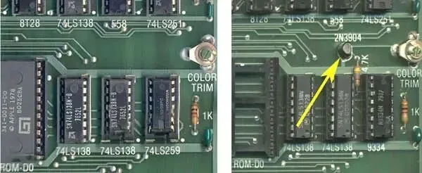 额外的高分辨率颜色:Rev0版主板在高分辨率模式下只能生成四种颜色:黑色、白色、紫色和绿色。沃兹尼亚克后来发现,对颜色电路进行微小的改动,就可以使高分辨率字节的第8位使紫色和绿色发生相位偏移,从而增加红色和蓝色高分辨率颜色。