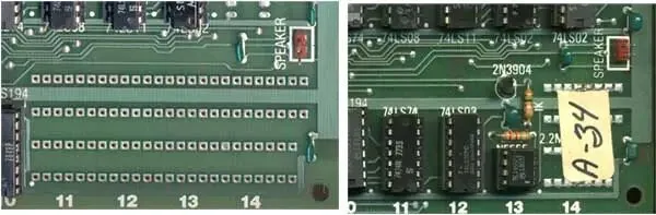 在Rev0版主板上,键盘下方的主板右下角有一块完全空着的区域,没有安装芯片。这是为爱好者添加自己的电路预留的。Rev1版主板则利用该区域安装了增加额外高分辨率颜色和开机自动复位电路所需的芯片。