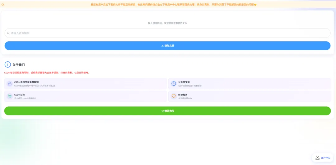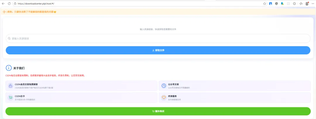 还在为CSDN会员专属资源发愁?看到好文章想保存却没办法?今天给大家安利一个宝藏下载中心,CSDN会员文章每日免费解锁2篇,公众号文章不限量免费解析!