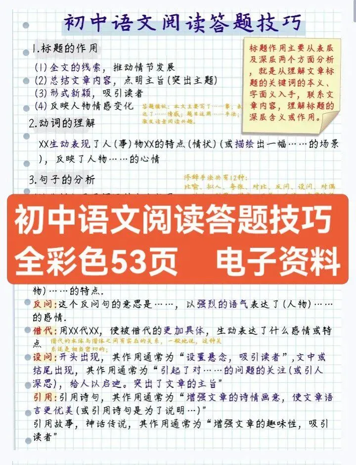 【速存】初中语文阅读理解答题模板技巧免费分享|53页彩色笔记PDF下载