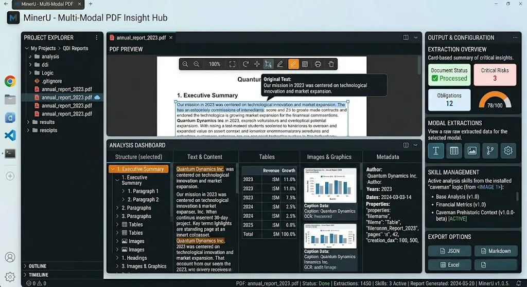 MinerU,上海AI Lab出的,专门优化了"干扰信息过滤"。网页型PDF、带大量广告的文档,用这个效果最好,综合准确率大概在92-95%。