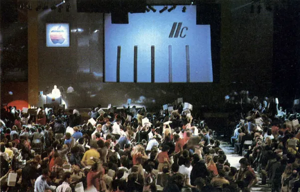 在“Apple II Forever”活动中,他们做的一件有趣的事情是 Apple IIc 的实际介绍。巨大的视频屏幕用于展示 Apple IIc 电视广告的预览,以及演讲者的幻灯片和图像,包括沃兹尼亚克(Wozniak)、乔布斯和苹果新总裁约翰·斯卡利(John Sculley)。斯卡利谈到了“分享权力”,然后以一种独特的方式展示了这一点:“在举起小巧的 Apple IIc 让每个人看到并引起他们想看得更清楚的反应后,斯卡利命令打开大厅灯光。当灯光亮起时,观众中几乎每五个人中就有一个人站起来,高举着一台 Apple IIc。当惊讶的经销商们热烈欢呼时,苹果员工将 Apple IIc 传递给他们。在介绍后的几秒钟内,超过一千名苹果经销商手中就有了生产线上的 Apple IIc。”