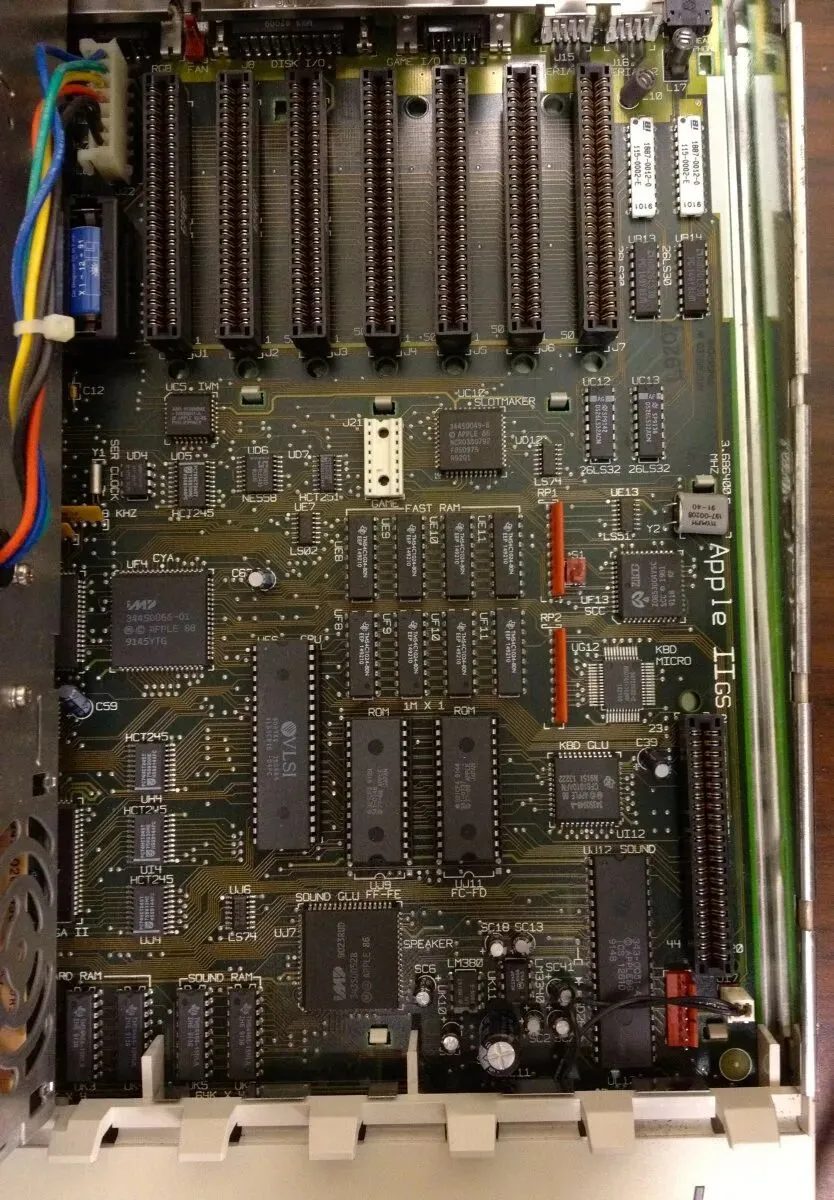 苹果工程师为了使 Apple IIGS 成为下一代计算机而增加的其他功能包括内置时钟、用于内部扩展卡的插槽空间,以及相当于七块更多扩展卡的电子元件。 借鉴他们在 Apple IIc 上的经验,工程师们将大多数用户希望使用的外围设备作为内置功能包含在内。他们将串行端口分配给插槽 1 和 2,将经典的 80 列固件分配给插槽 3,将鼠标控制器分配给插槽 4,将 Smartport 控制器分配给插槽 5,将 5.25 英寸磁盘控制器分配给插槽 6,并将 AppleTalk 功能分配给插槽 7。(AppleTalk 是苹果最初为 Macintosh 设计的网络协议)。