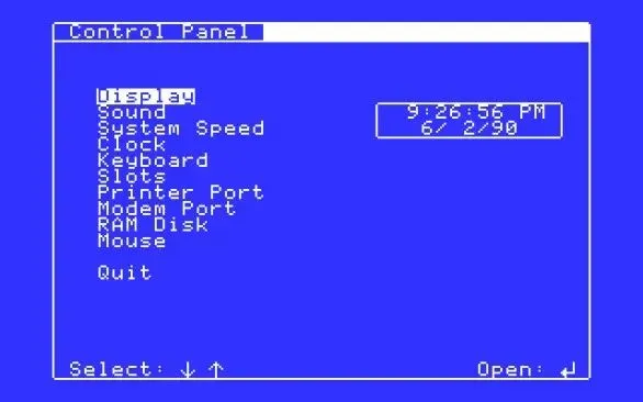 为了允许用户轻松地根据自己的喜好配置Apple IIGS 的某些功能,设计了一个“控制面板”(另一个从 Macintosh 借鉴的想法)。它用于设置时钟、系统速度(在“正常”1 MHz 和“快速”2.8 MHz 之间)、将标准文本显示从 40 列更改为 80 列、设置文本屏幕的颜色、设置鼠标和键盘的灵敏度,以及为打印机和调制解调器端口设置标准参数。这些首选项被保存在一个特殊的电池供电 RAM 中,即使系统电源关闭也能保留。