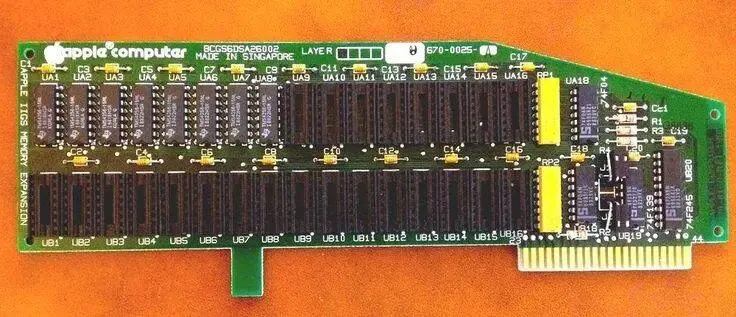 他们正在打造的Apple IIGS 是当前型号功能的逻辑延伸,结合了新出现的Apple IIGS 软件最需要的功能。GS/OS 的最新版本继续需要更多内存才能正常运行,因此这台计算机的主板上配备了 2 兆字节(2 Meg)的内存。为了进行超过此最低限度的内存升级,旧的内存扩展插槽被取消,取而代之的是两个用于 SIMM(单列直插内存模块)内存卡的插槽。这些紧凑的封装正成为行业标准,并被包含在所有更新的 Macintosh 型号中。