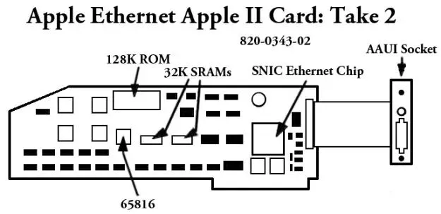 随着基于以太网协议的网络增加,Apple II 网络硬件的下一个明显演变是创建一块以太网外围卡,其工作方式与工作站卡在 AppleTalk 和 AppleShare 上的工作方式相同。到 1991 年,苹果的 Apple II 小组的工程师已经完成了一块基于工作站卡的设计,具有相同的通过以太网连接启动 Apple II 或Apple IIGS 或向该网络上的中央打印机打印的能力。该卡的原始设计使用了一个 2 MHz 的 65C02 处理器,32K 的 RAM 用于数据包缓冲和杂项卡使用,以及 128K 的 ROM(分为四个库,根据需要交换,有点像 Apple IIe 和 IIc 计算机上的额外 ROM 代码)。这个 ROM 代码处理网络通信的 AppleTalk 协议。该卡将使用 AAUI(Apple Attachment Unit Interface,苹果专有的以太网连接器)将卡插入网络。