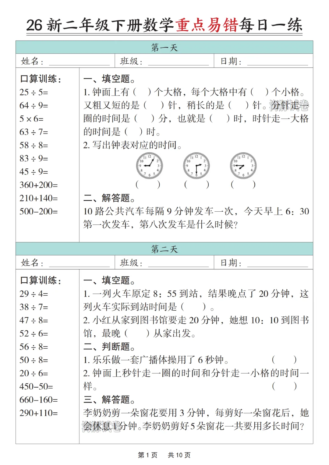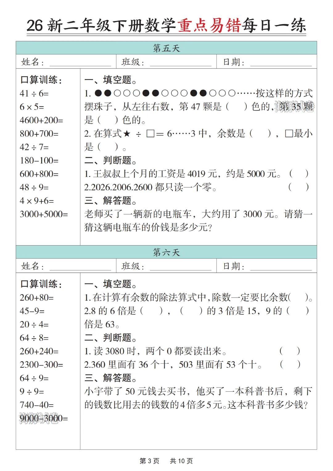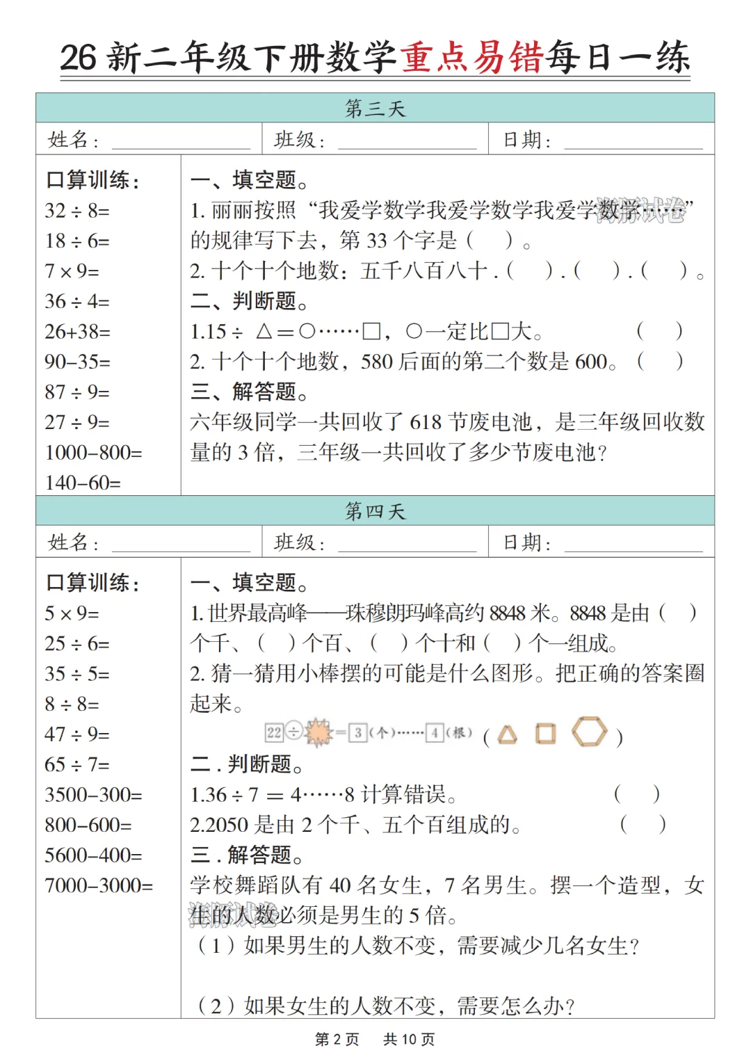二年级(下)数学重点易错每日一练,可打印,PDF电子版