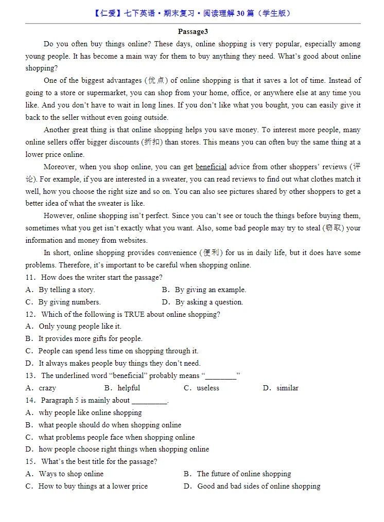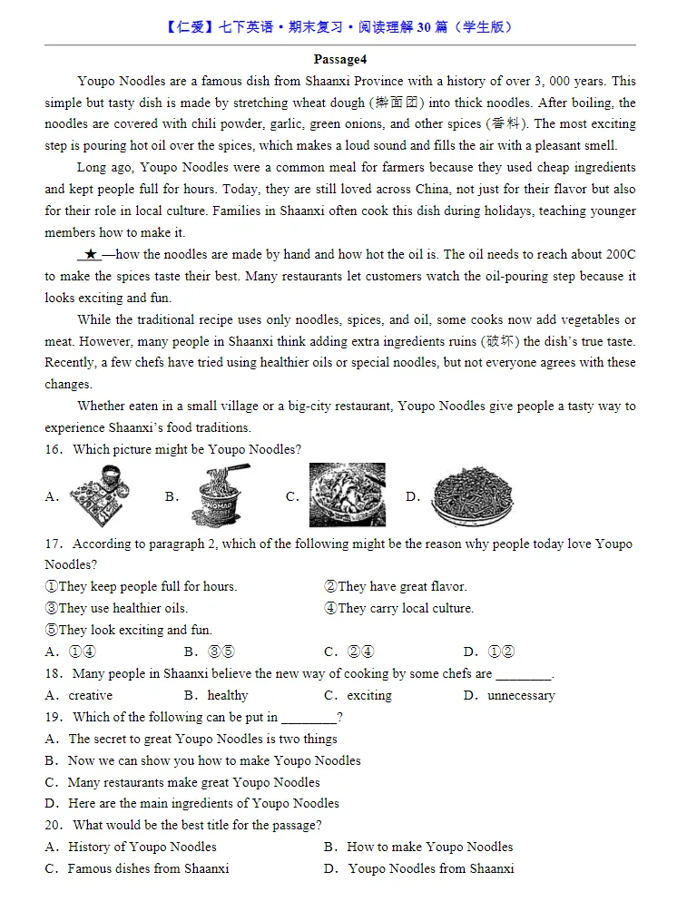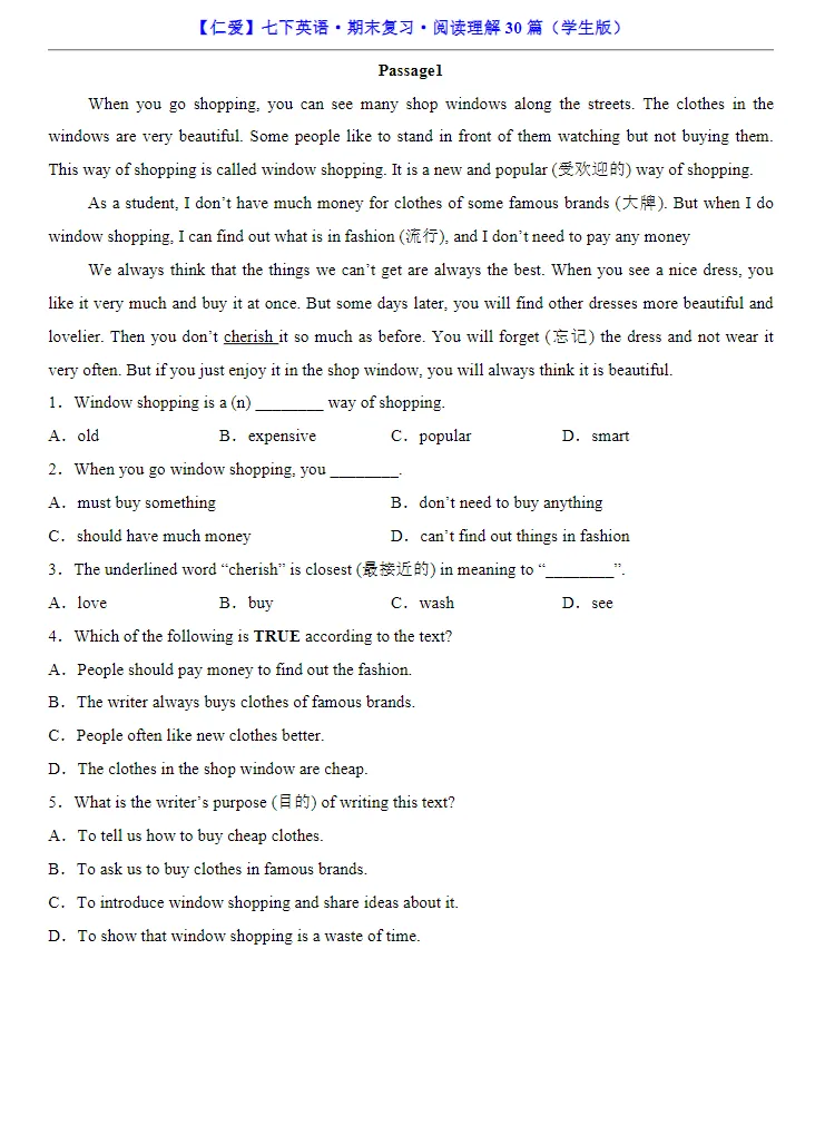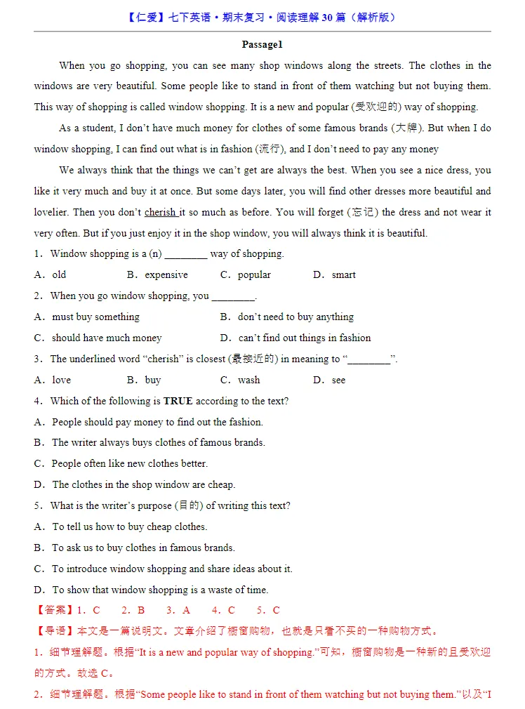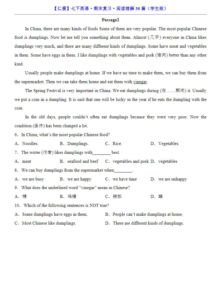 小鹿老师今日整理了:七年级下册仁爱版英语必考阅读理解专练30道,孩子预习复习必备的资料,家长们可以保存下载打印让孩子练习,助力孩子提高成绩!