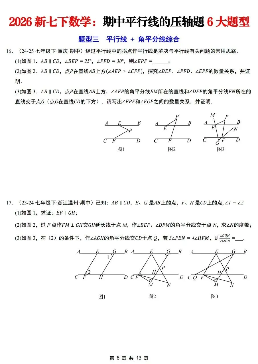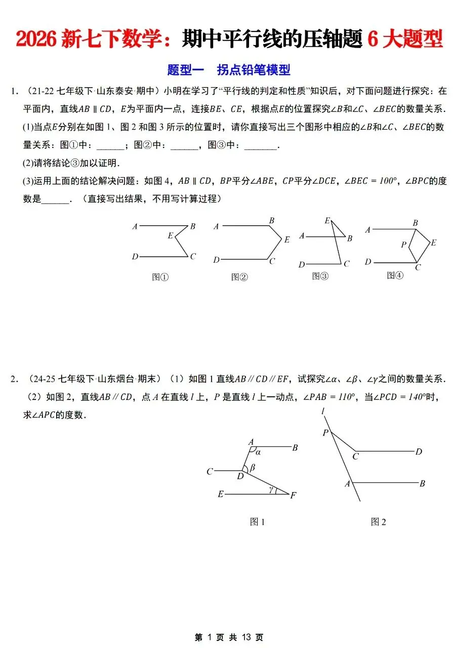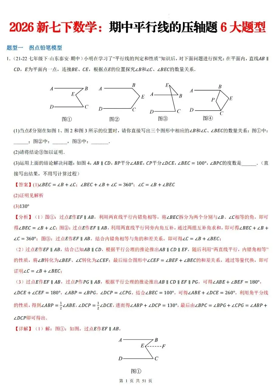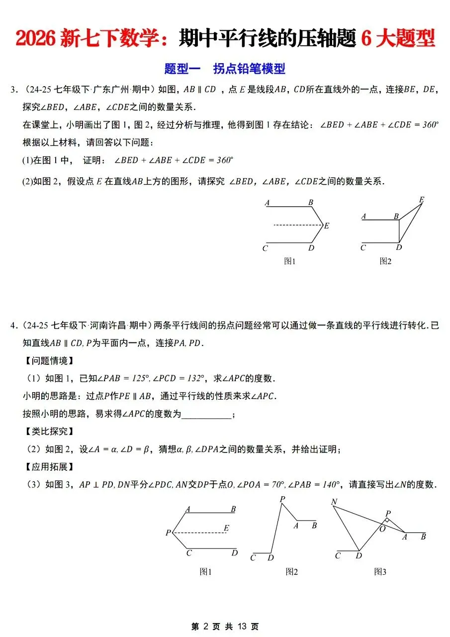 26年春七年级下册人教版北师版通用数学期中平行线的压轴题6大题型【拐点铅笔模型,多拐点锯齿模型,平行线+角平分线综合,平行线+三角板旋转,平行线+折叠问题,证明探究类压轴】,完整电子版含答案解析可打印