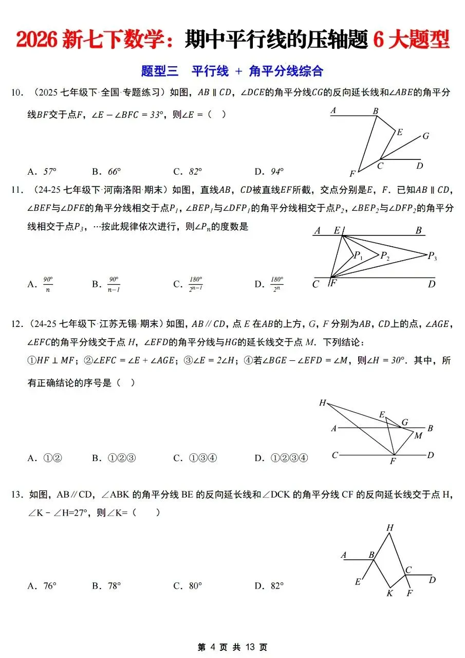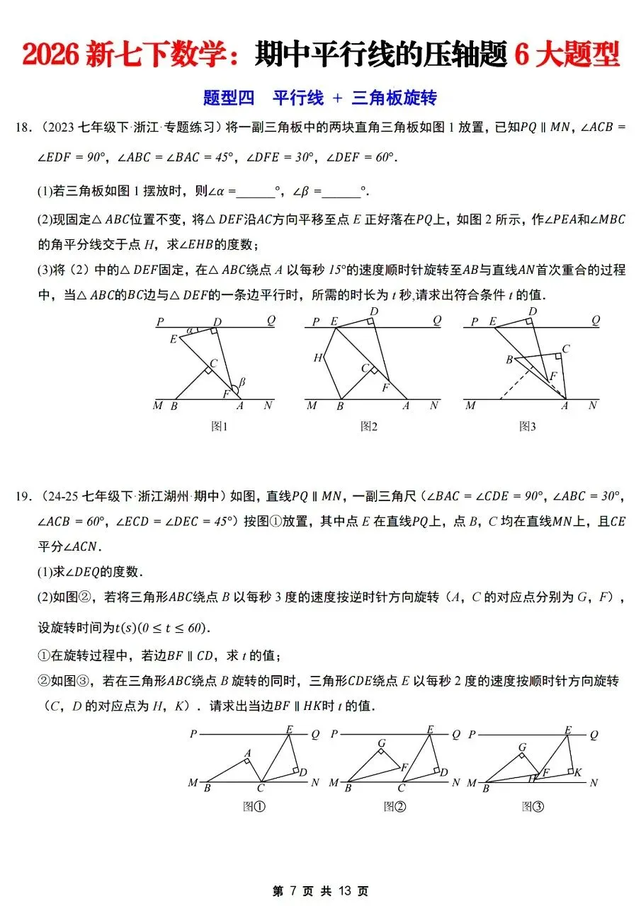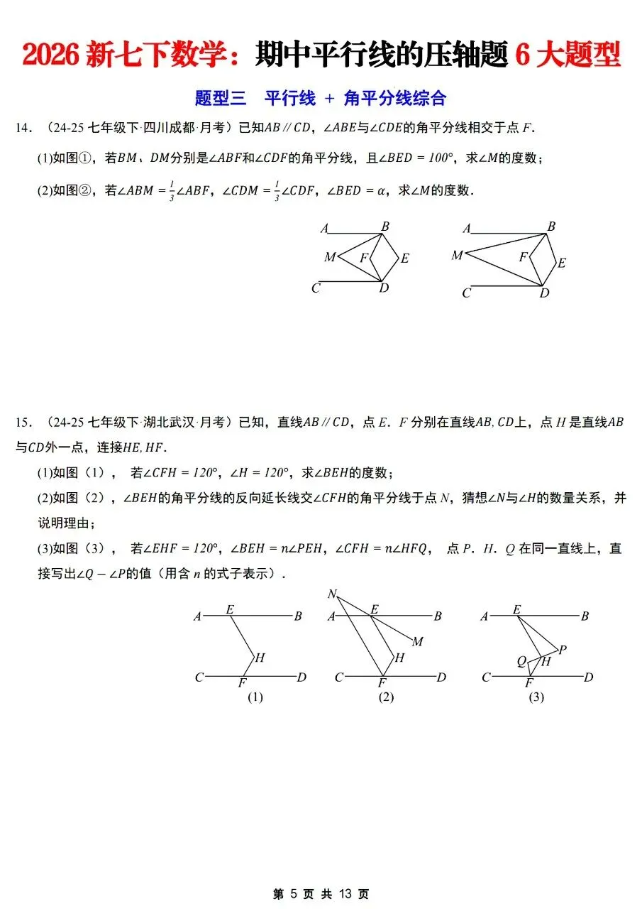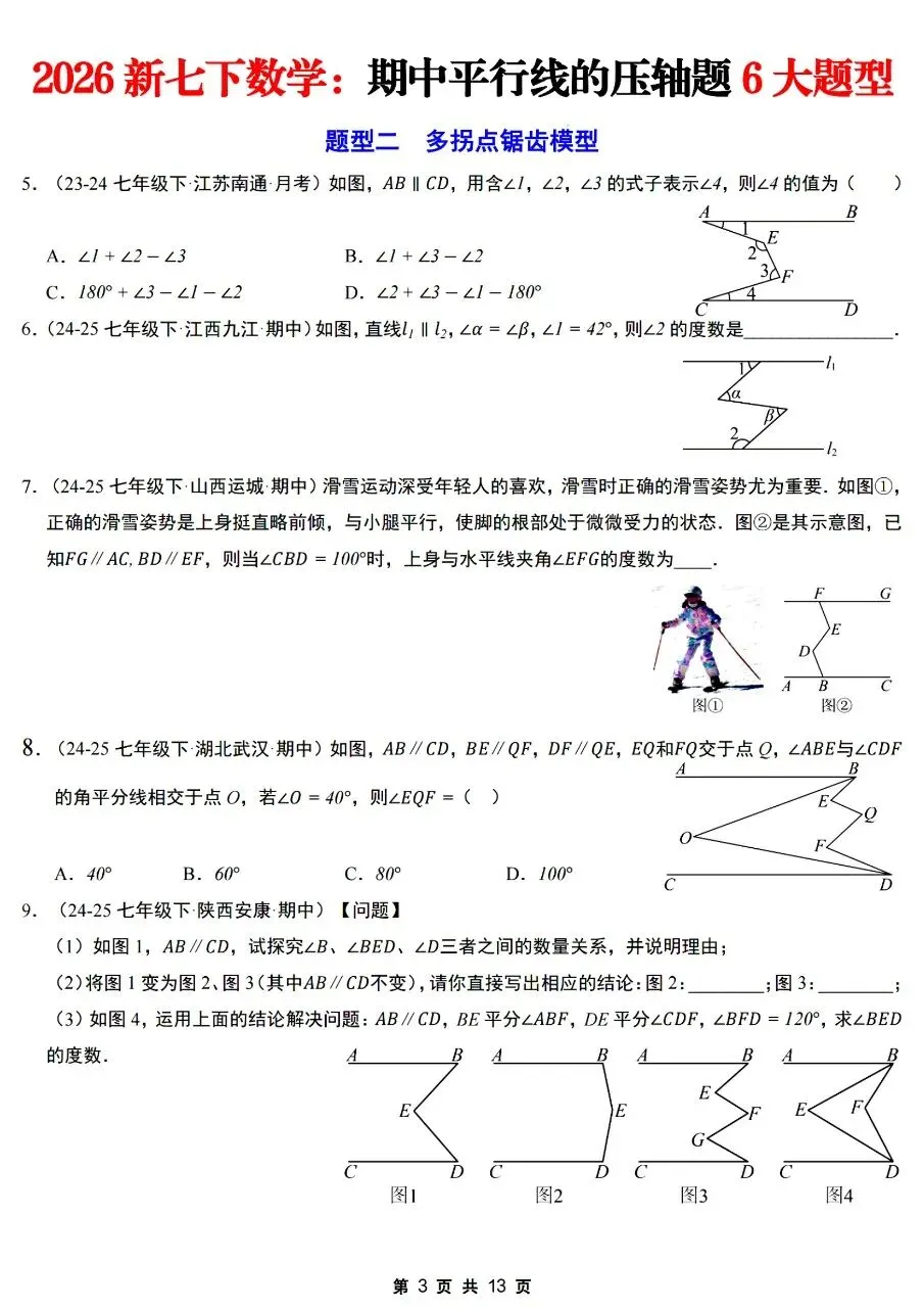 26年春七年级下册人教版北师版通用数学期中平行线的压轴题6大题型【拐点铅笔模型,多拐点锯齿模型,平行线+角平分线综合,平行线+三角板旋转,平行线+折叠问题,证明探究类压轴】,完整电子版含答案解析可打印