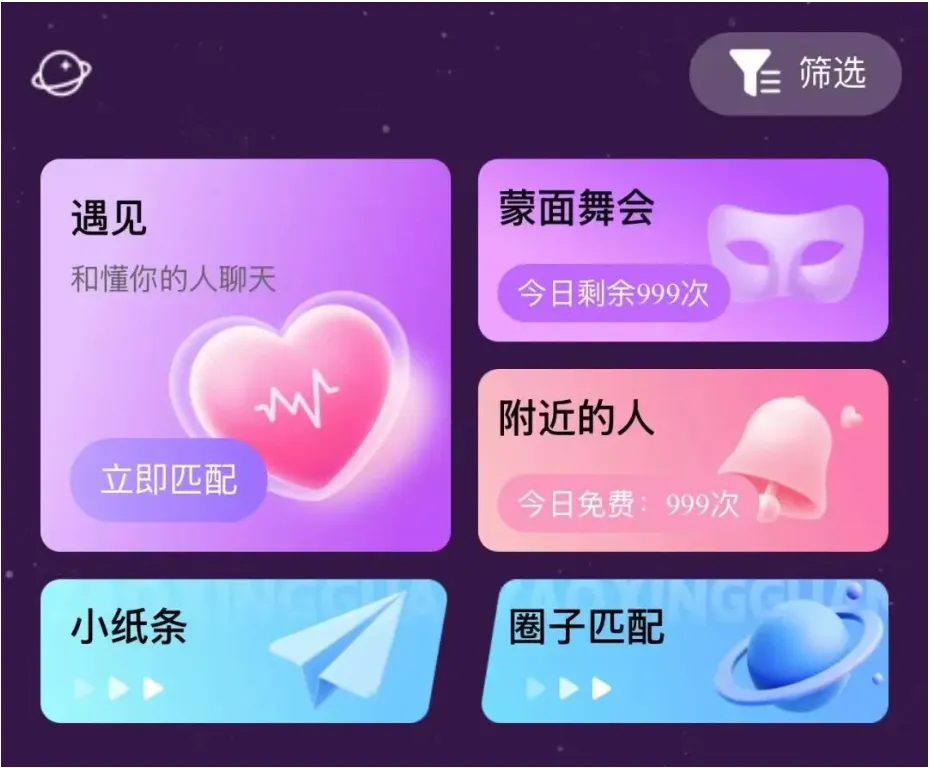 我们打造了丰富多样的高互动社交玩法,包括遇见、蒙面舞会、附近的人、小纸条等,让用户轻松结识新朋友。