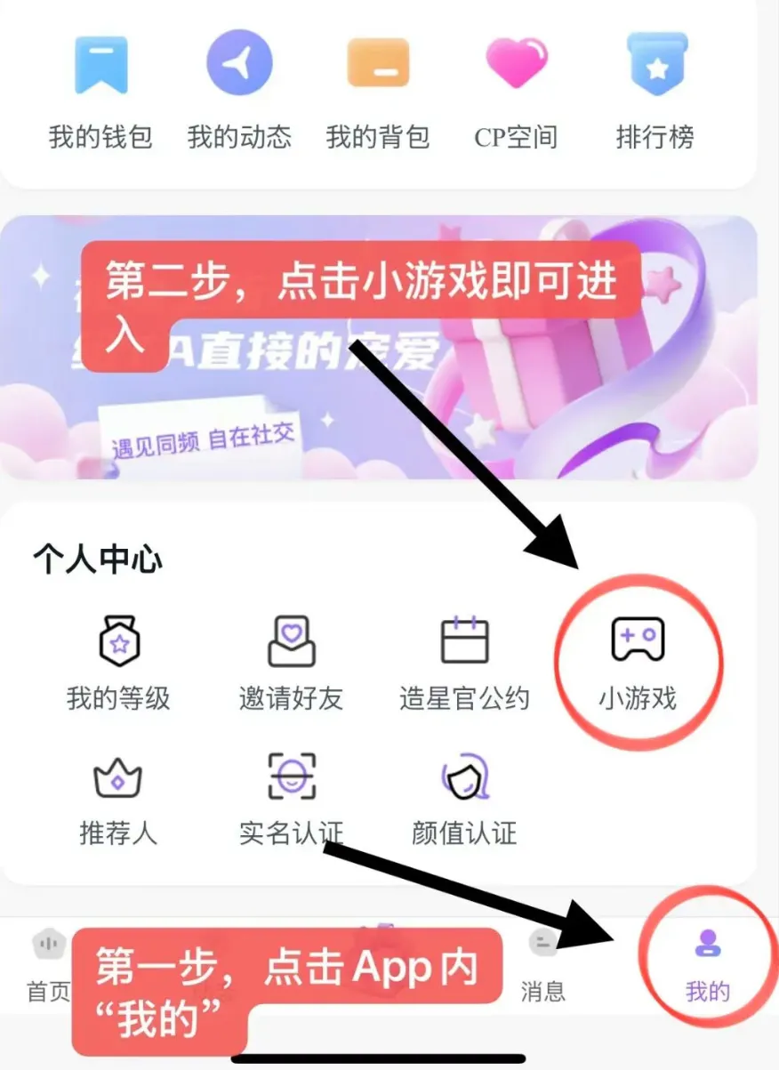 打开造星官 APP 点击底部导航栏 **"我的"** 找到 **"小游戏"** 入口 点击后自动跳转微信,即可畅玩所有游戏