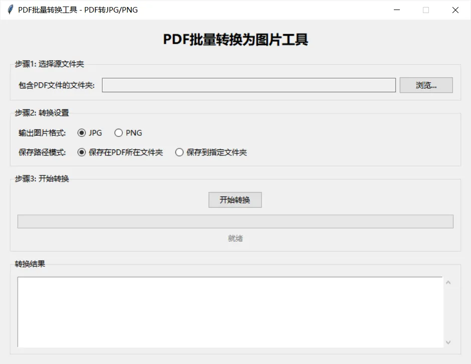 ┌────────────────────────────────────────────┐│ 步骤1: 选择源文件夹 ││ [包含PDF文件的文件夹...] [浏览...] │├────────────────────────────────────────────┤│ 步骤2: 转换设置 ││ 输出格式: ○ JPG ○ PNG ││ 保存路径: ○ 保存在PDF所在文件夹 ││ ○ 保存到指定文件夹 │├────────────────────────────────────────────┤│ 步骤3: 开始转换 ││ [开始转换] ││ [████████████████░░░░░░] 进度条 │├────────────────────────────────────────────┤│ 转换结果 ││ ✓ 文件1.pdf - 转换成功 ││ ✓ 文件2.pdf - 转换成功 ││ ✗ 文件3.pdf - 失败: 文件被占用 │└────────────────────────────────────────────┘五、详细操作步骤