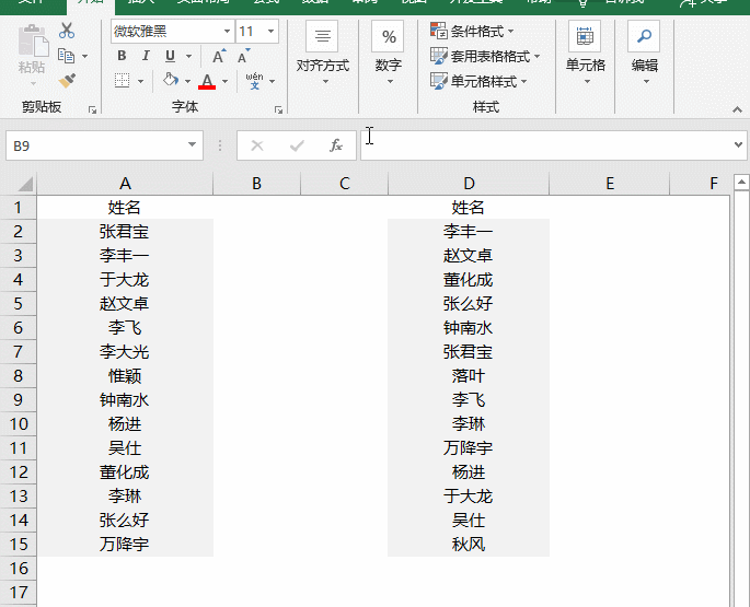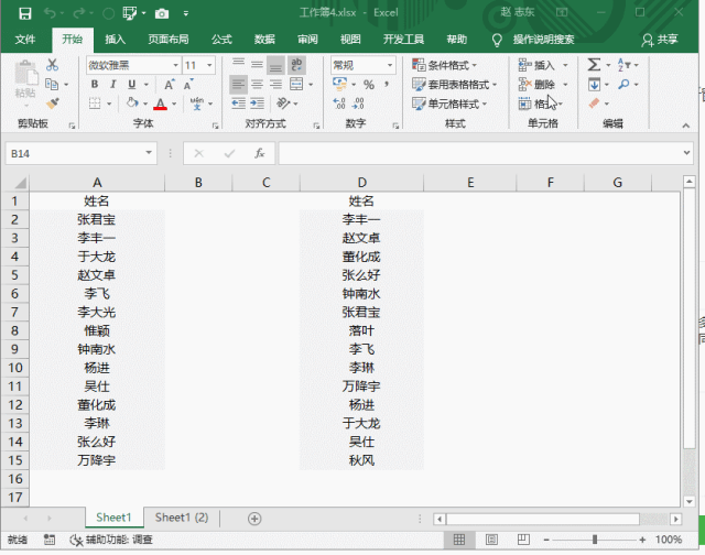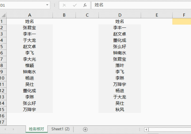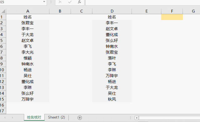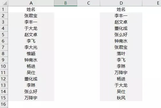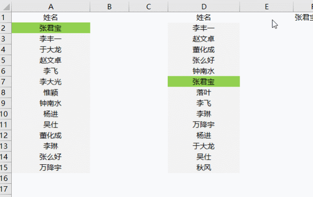 但如果要找A列中的姓名(如张君宝),在D列中的位置,以便查找其他信息。