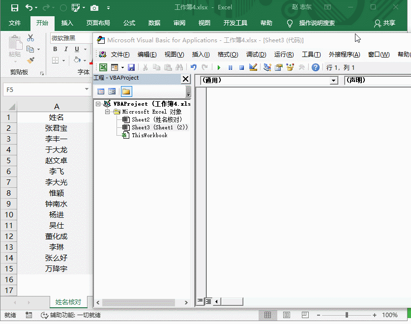 代码解释:F1为单元格地址(可修改为任一空单元格),target为当前操作的单元格(在第一行代码当中,可找到它)。