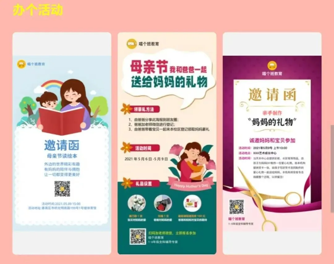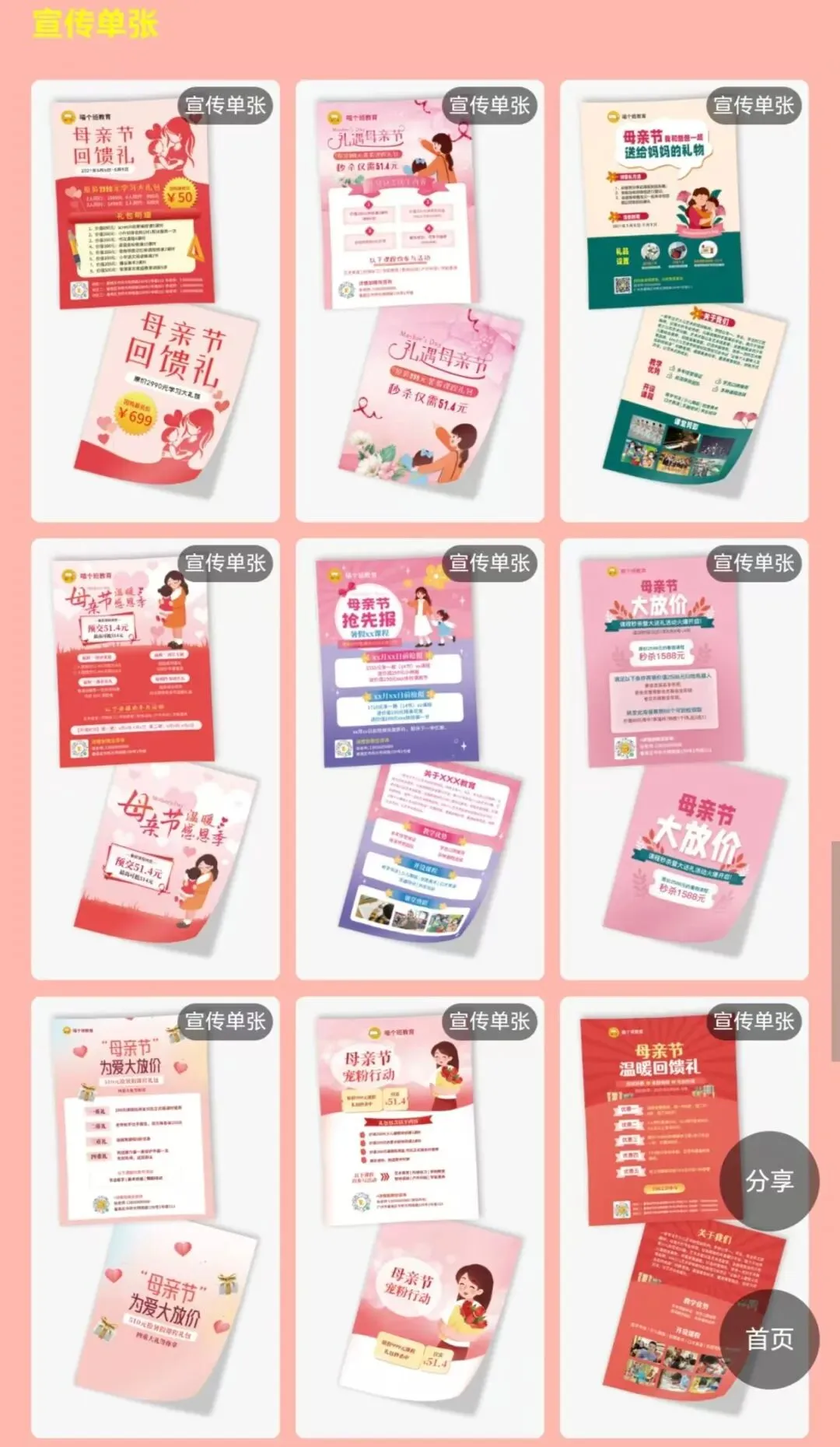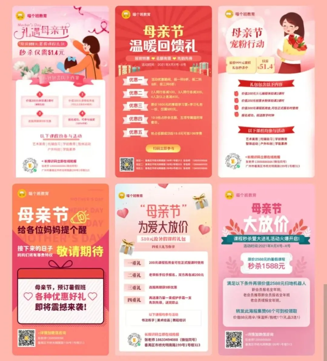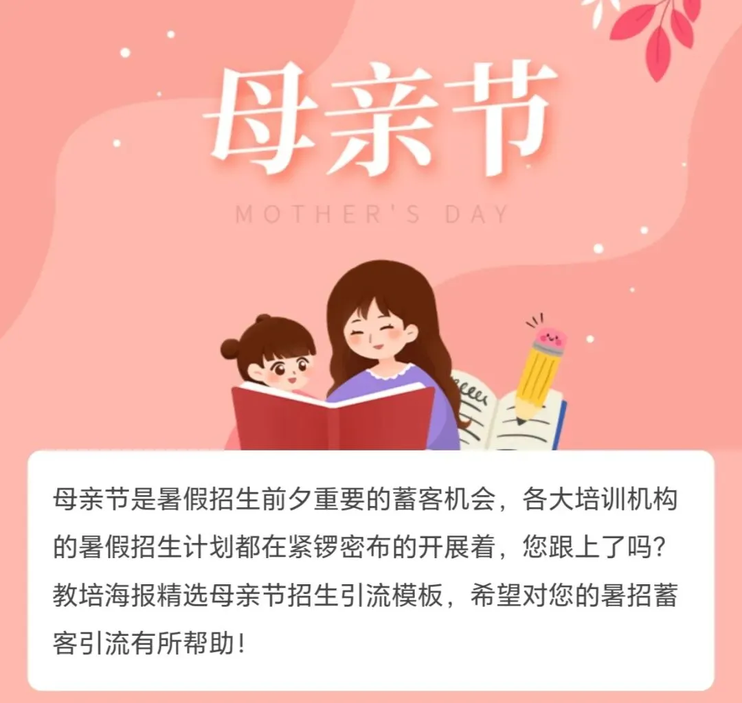 抓住母亲节招生红利!教培机构成品海报模板,下载即用↓↓↓教培人,注意啦!【教培海报】已上新各类“母亲节主题招生海报模板”一键下载,即可发圈! 一起来看看吧!【1.母亲节祝福语海报】【2.母亲节活动邀请函】【3.母亲节招生营销海报】【4.母亲节招生宣传单页】仅展示部分......【以上母亲节海报模板,均支持编辑修改,下载即用】教培人,可扫码体验教培海报立刻开启高效招生宣传模式
