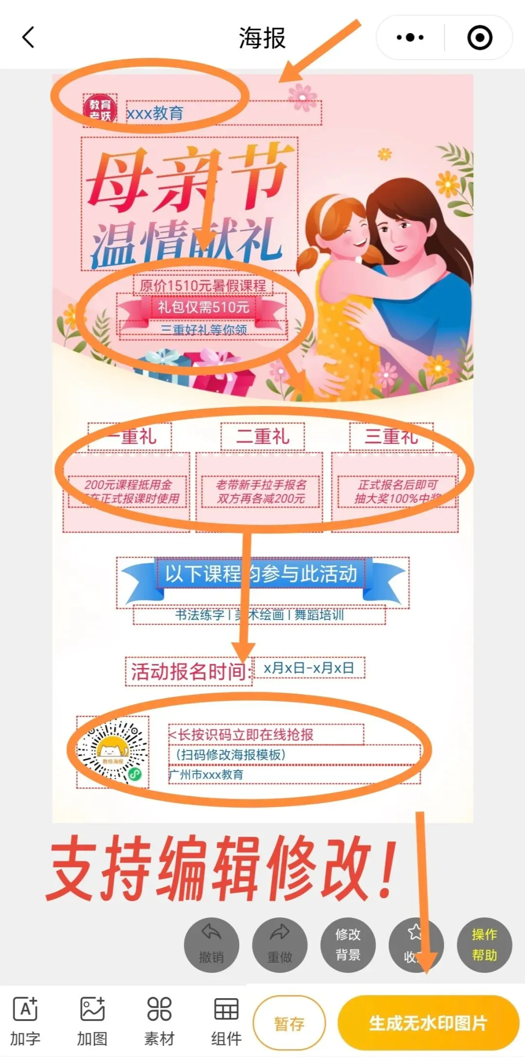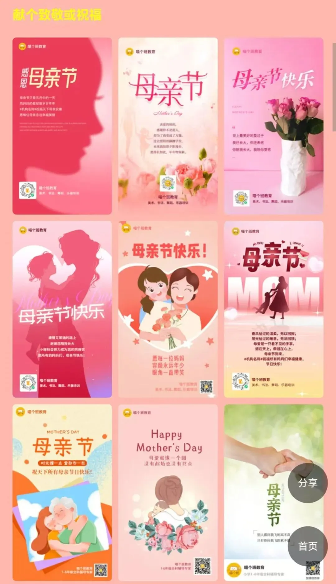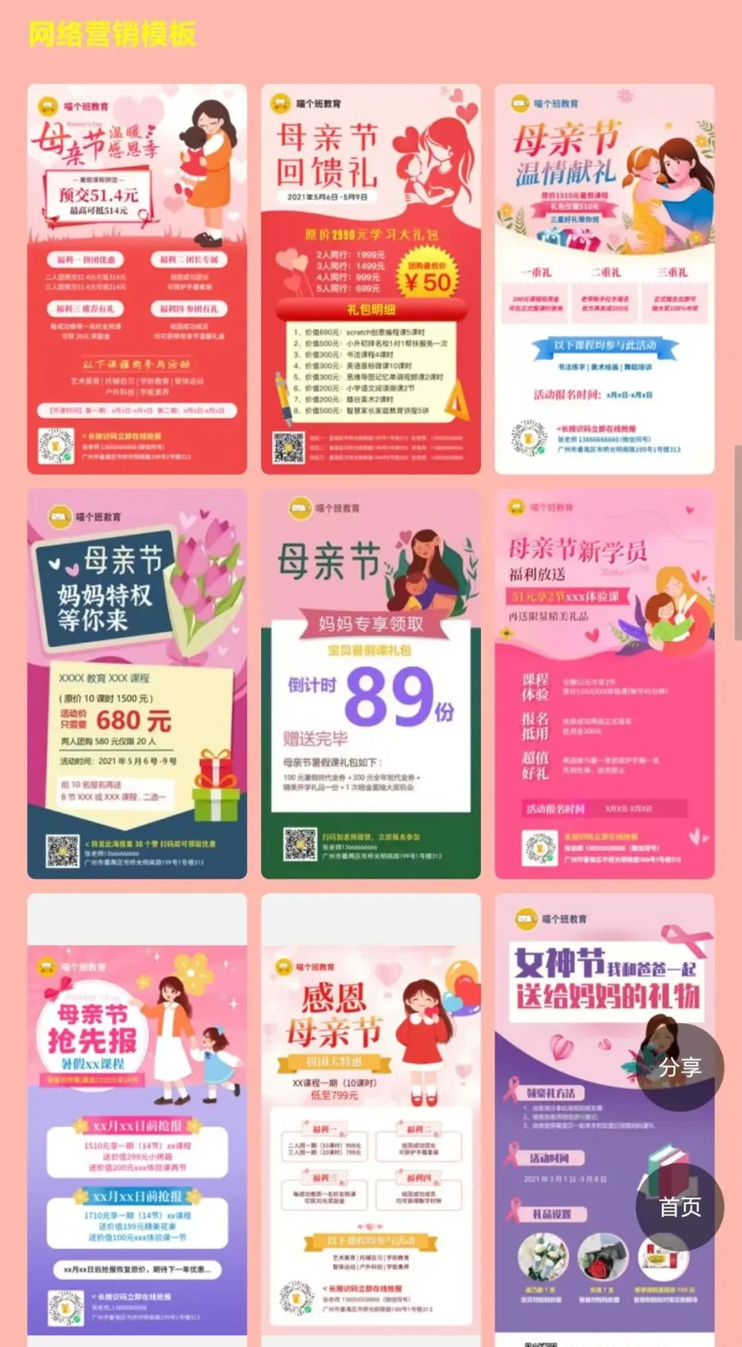 抓住母亲节招生红利!教培机构成品海报模板,下载即用↓↓↓教培人,注意啦!【教培海报】已上新各类“母亲节主题招生海报模板”一键下载,即可发圈! 一起来看看吧!【1.母亲节祝福语海报】【2.母亲节活动邀请函】【3.母亲节招生营销海报】【4.母亲节招生宣传单页】仅展示部分......【以上母亲节海报模板,均支持编辑修改,下载即用】教培人,可扫码体验教培海报立刻开启高效招生宣传模式