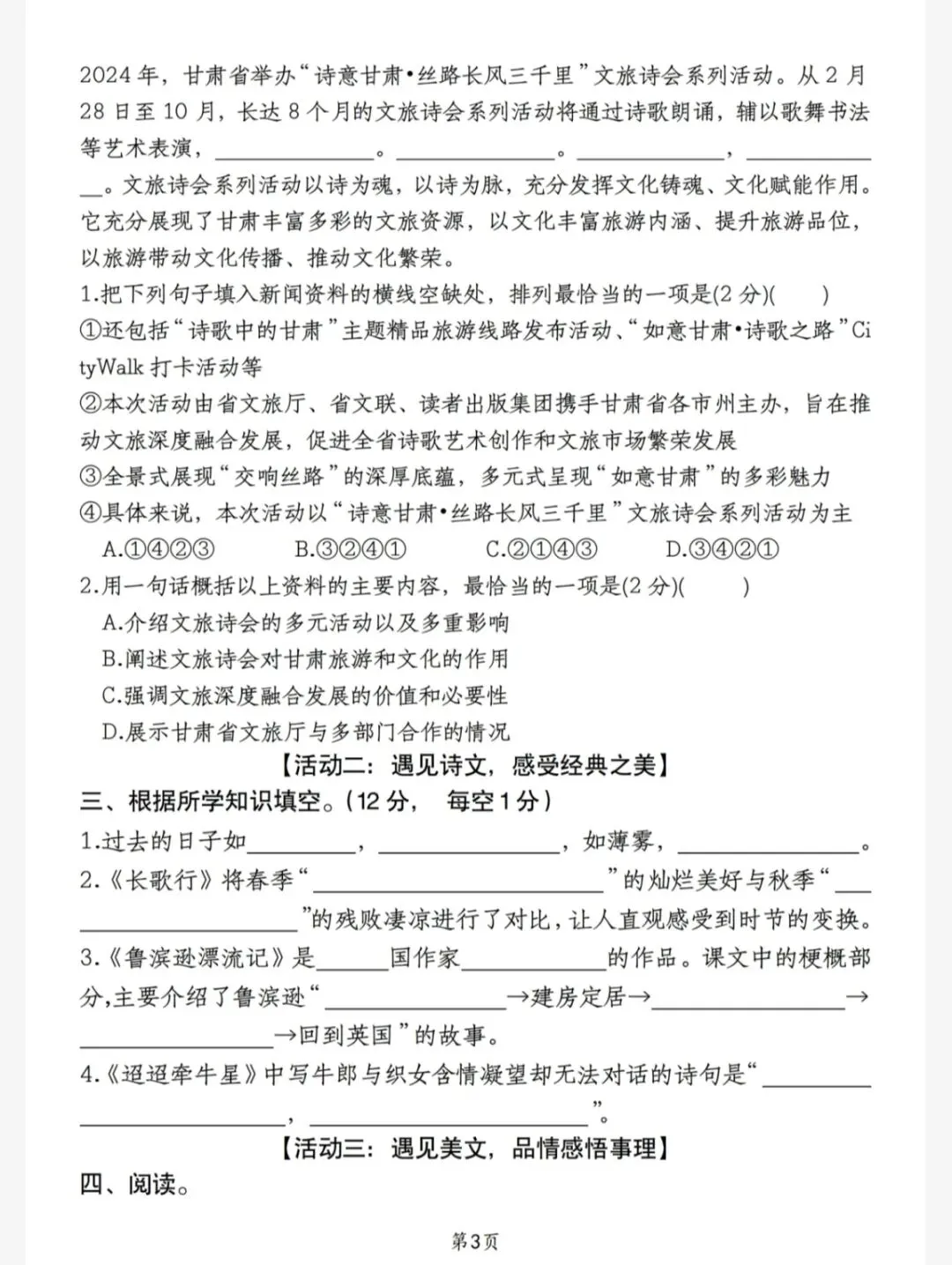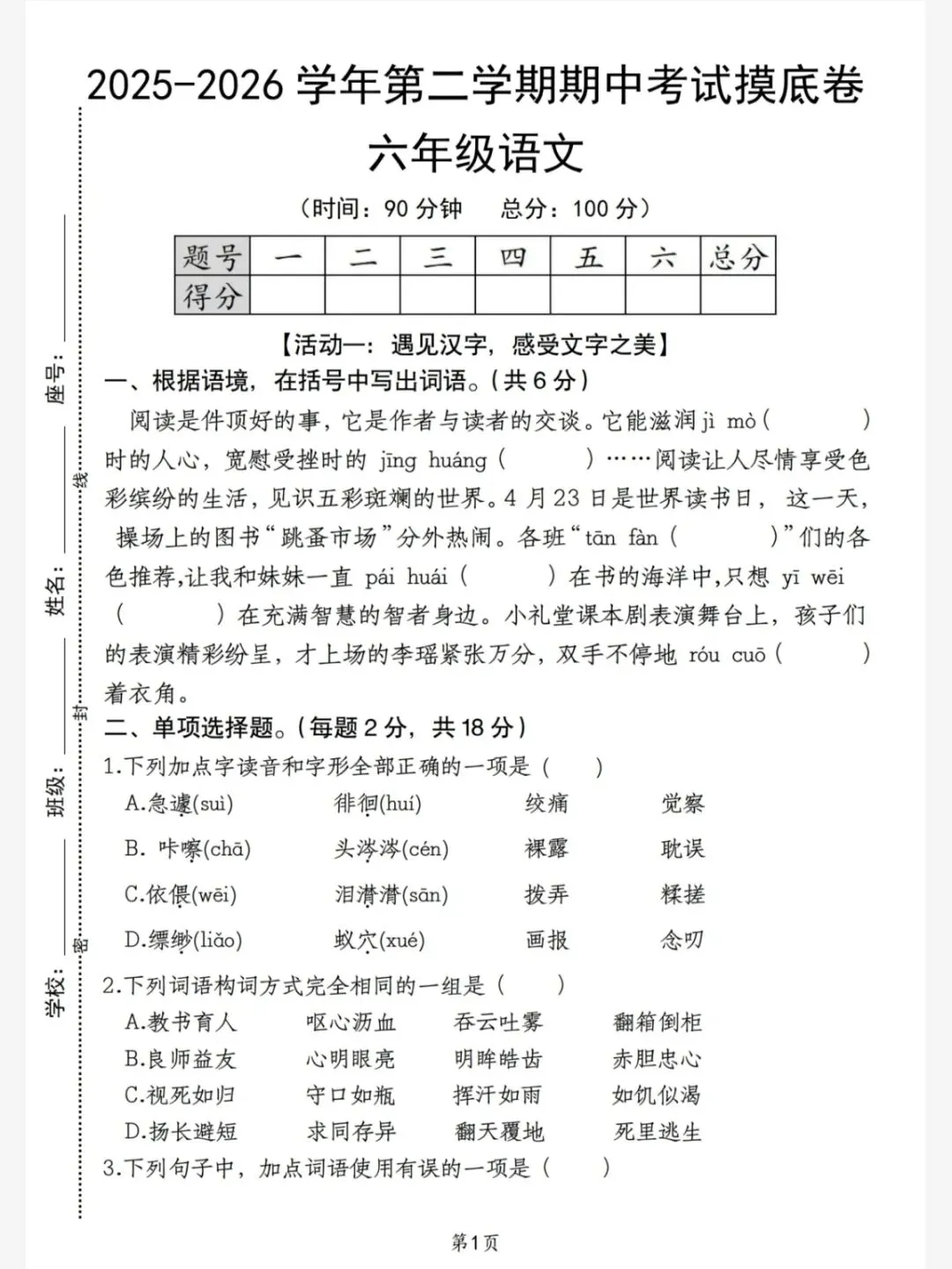 【活动一:遇见汉字,感受文字之美】一、根据语境,在括号中写出词语。(共6分)