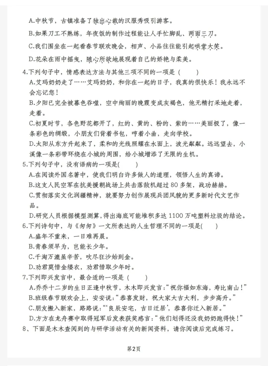 7.下列即兴发言中,最合适的一项是( )A.乔乔十二岁的生日正逢中秋节,木木即兴发言:“祝你福如东海,寿比南山!”