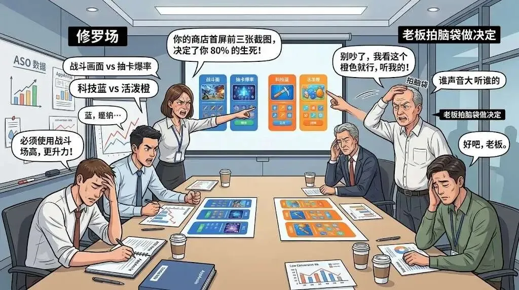 然而,当团队在会议室里争论“第一张截图应该放游戏战斗画面,还是放抽卡爆率”,或者“工具软件的背景底色是用科技蓝好,还是活泼橙好”时,绝大多数老板和主美最终是靠“拍脑袋”或者“谁声音大听谁的”来做决定。