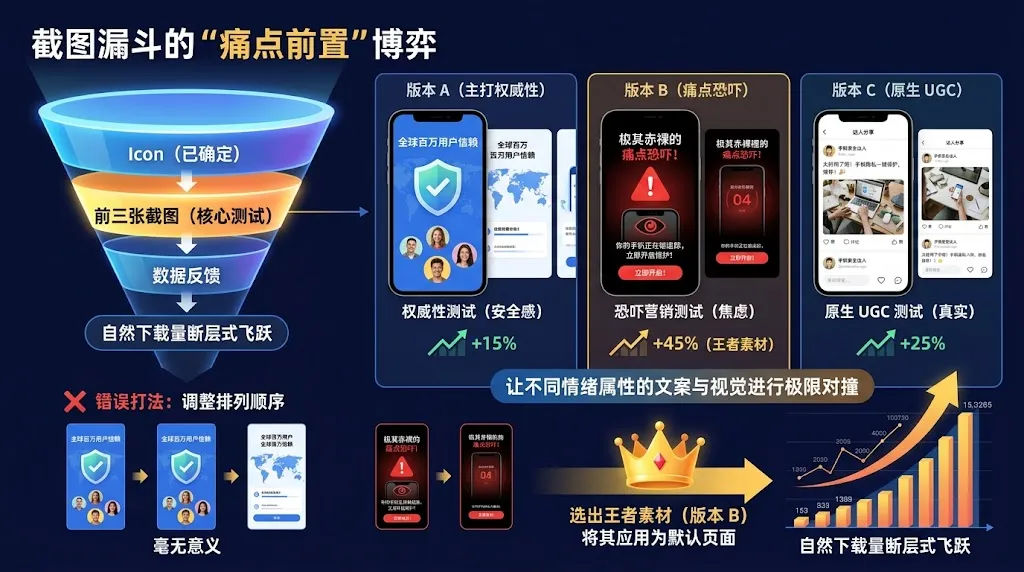 高阶测试: 版本 A 的第一张截图主打“权威性(全球百万用户信赖)”;版本 B 的第一张截图主打“极其赤裸的痛点恐吓(你的手机正在被追踪,立即开启保护!)”;版本 C 采用极其原生的 UGC 风格(看起来像一张达人的朋友圈截图)。 让不同情绪属性的文案与视觉进行极限对撞。数据会毫不留情地告诉你,你的海外受众到底是更吃“安全感”还是更吃“恐吓营销”。一旦选出王者素材,将其应用为默认页面,你的自然下载量将实现断层式飞跃!