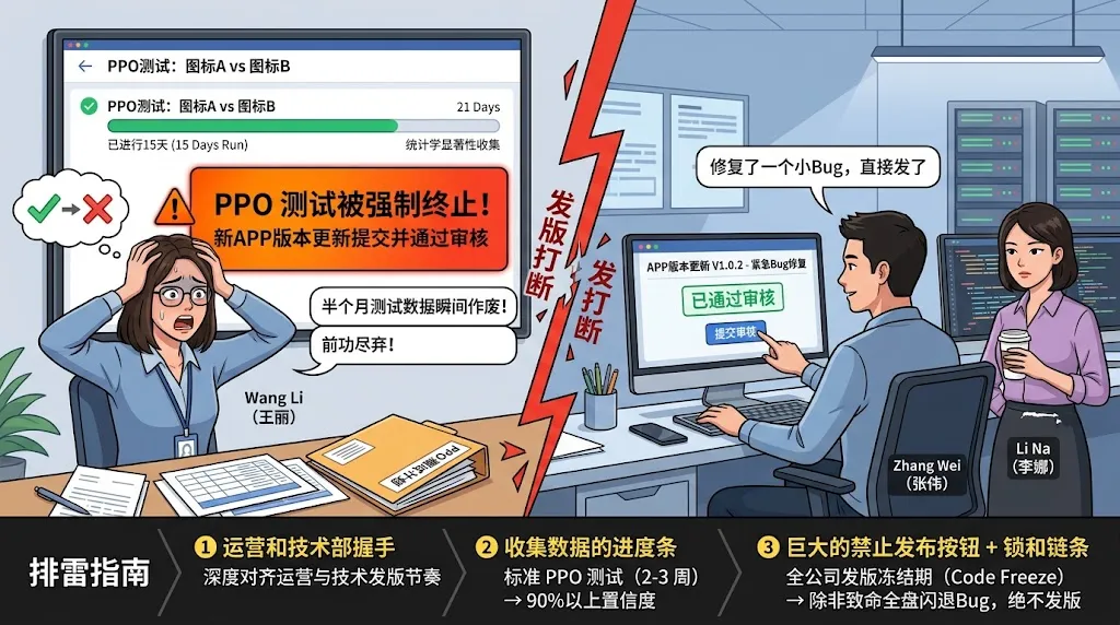 排雷指南: 运营必须与技术发版节奏深度对齐。一个标准的 PPO 测试往往需要 2-3 周才能收集到具有统计学显著性(90% 以上置信度)的数据。在测试期间,全公司必须进入“发版冻结期(Code Freeze)”,除非是引发全盘闪退的致命 Bug,否则绝不发版!