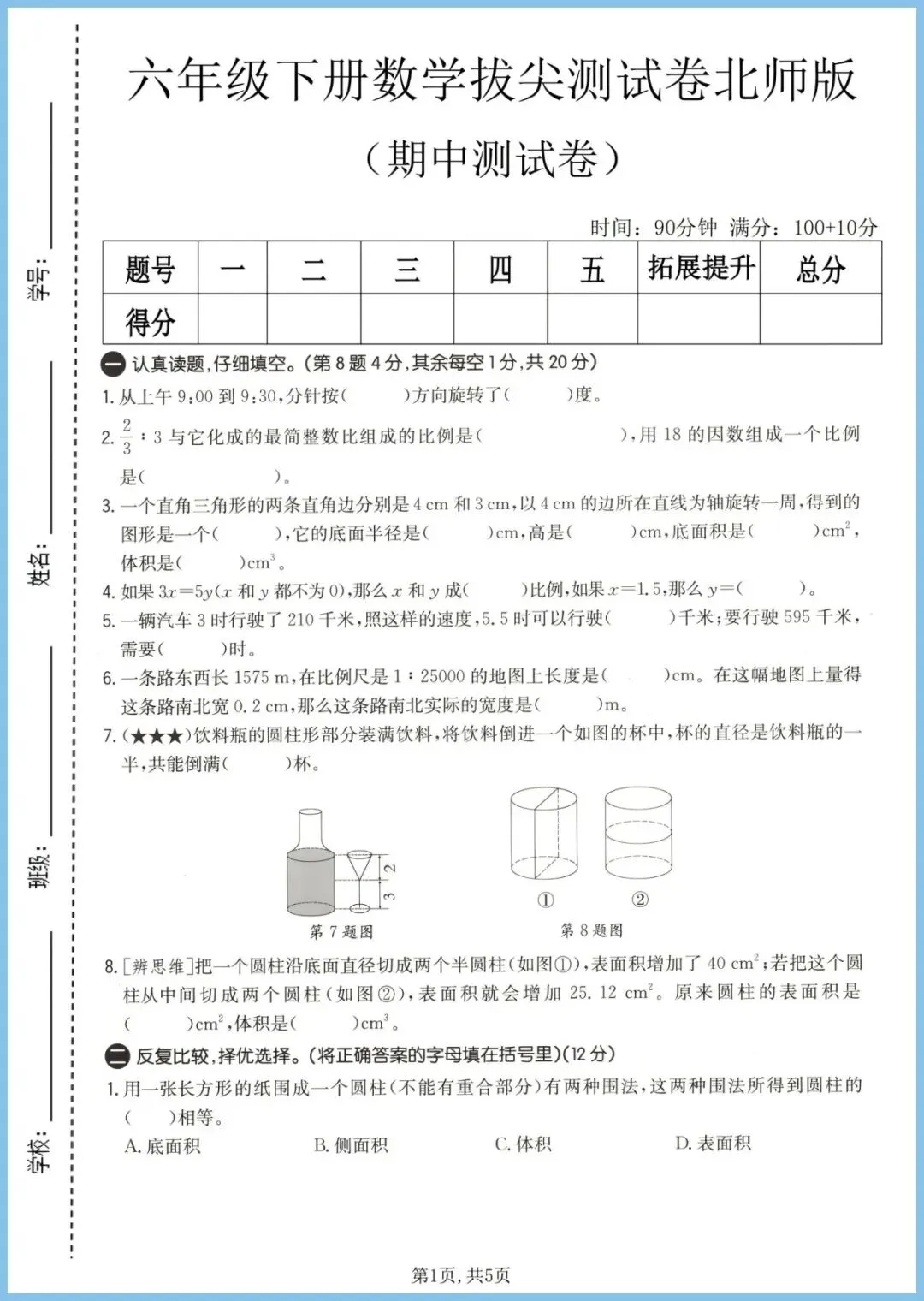 2026春北师版六年级下册数学《期中拔尖测试卷2》新鲜出炉,5页高清电子版,一键就能打印!这份拔高卷紧贴期中重难点,集合计算提速、图形与几何、应用题思维拓展三大模块,每道题都配有“思路点拨易错警示”,让孩子在做题中学会举一反三,冲刺满分。现在练,期中不慌,高分稳拿!需要的家长赶紧打印,给孩子限时练起来吧!