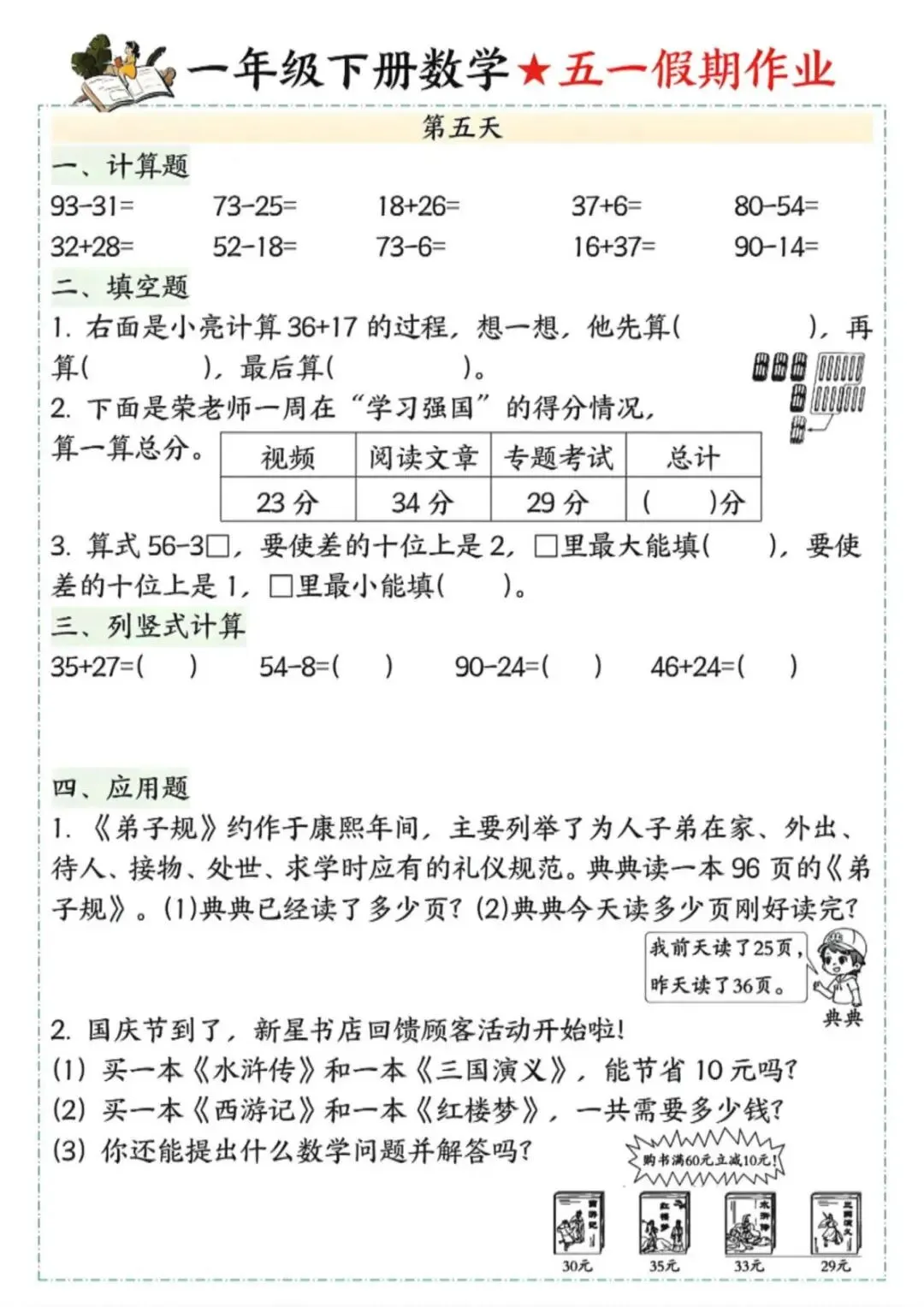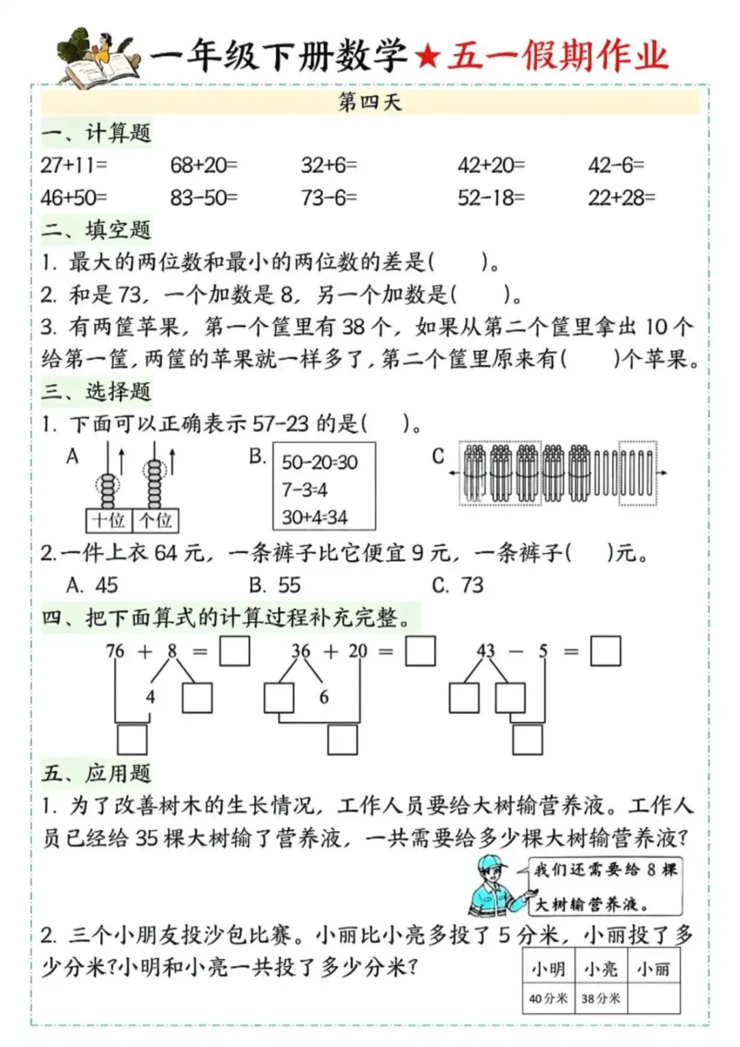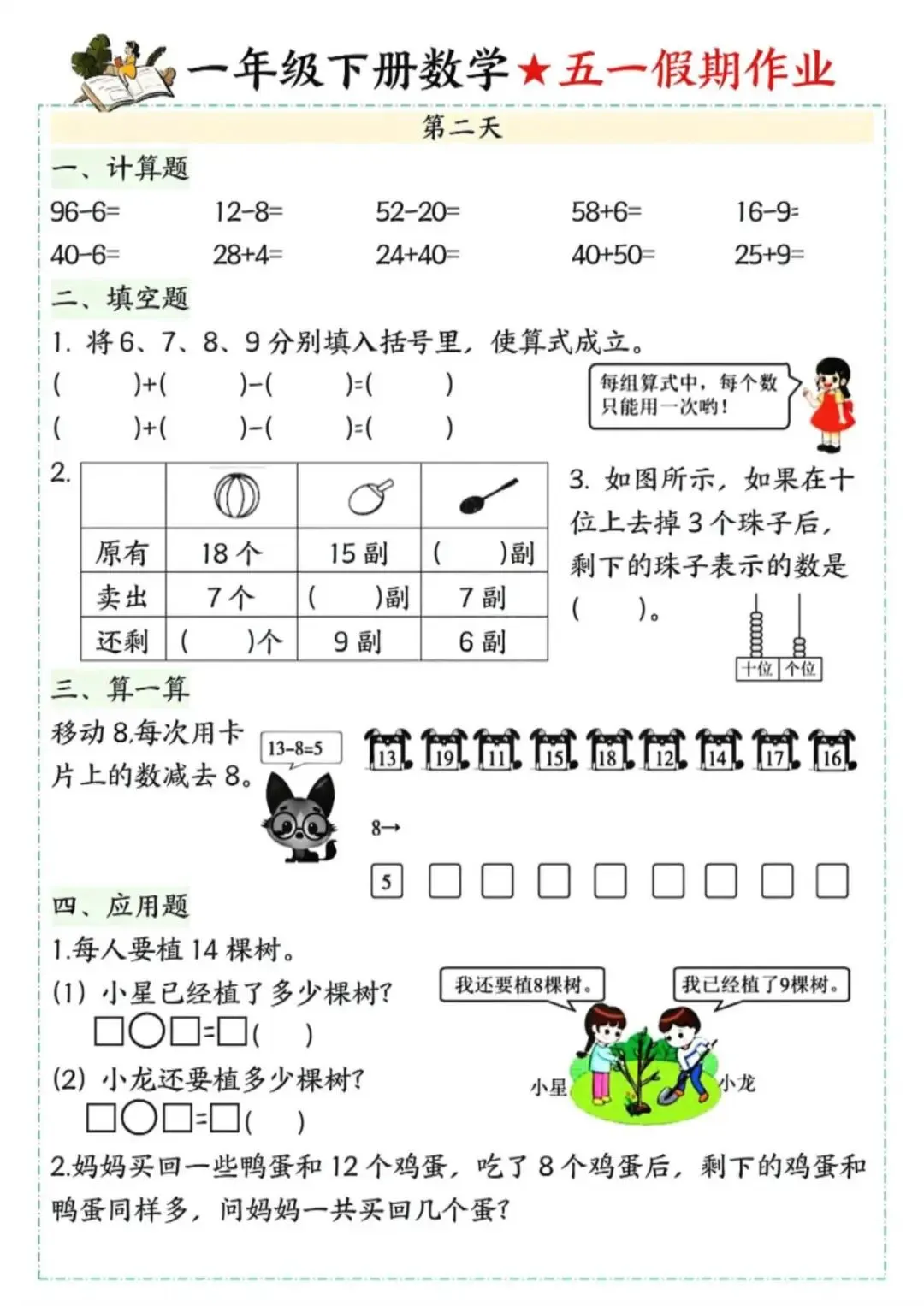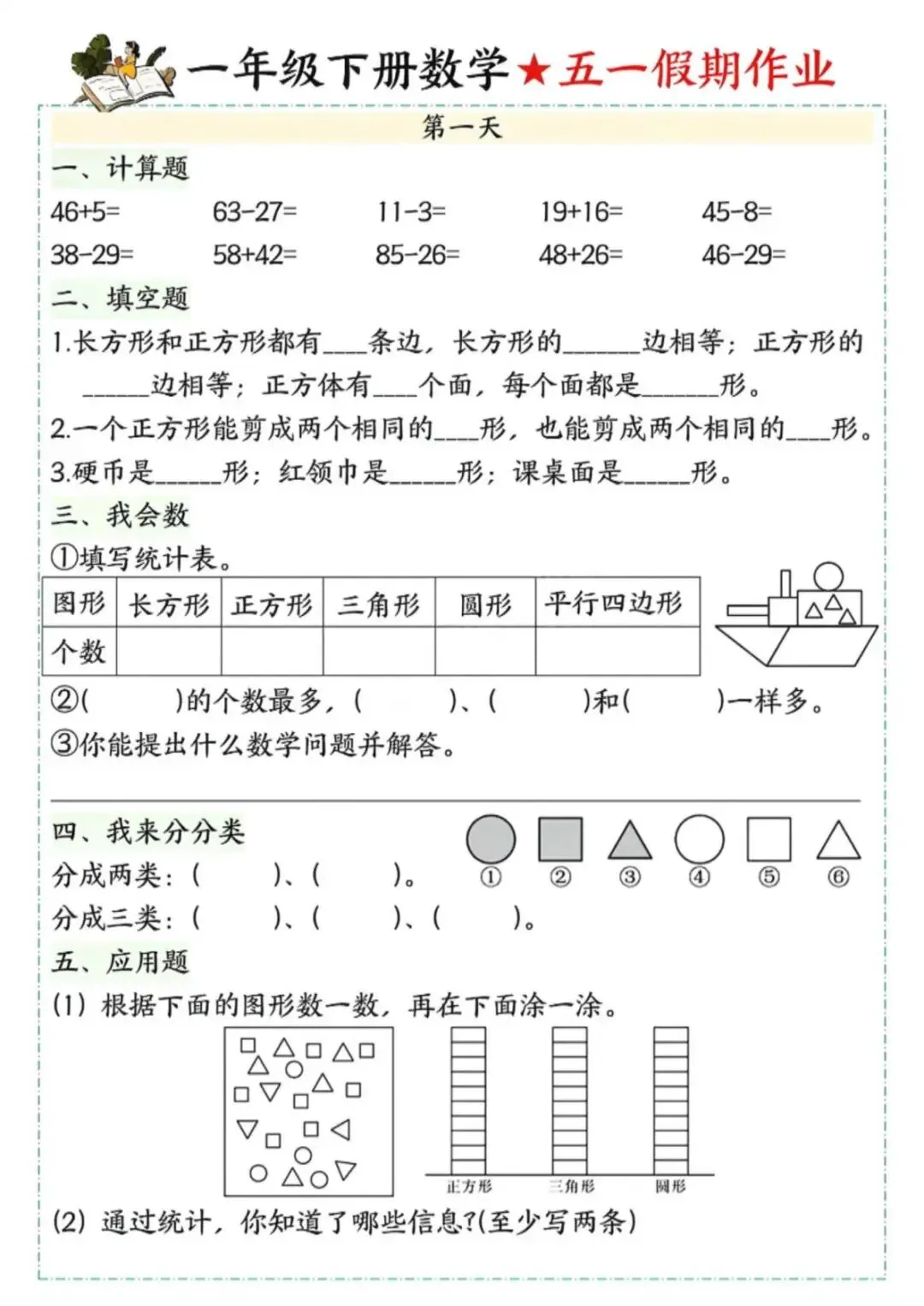 五一假期即将来临,小盆友的学习不能间断,这份五一假期作业包含计算题、填空题、分类应用题等,需要的家长和老师可以保存让孩子做一做吧!欢迎分享至班级群或家长群,方便分享使用哦!