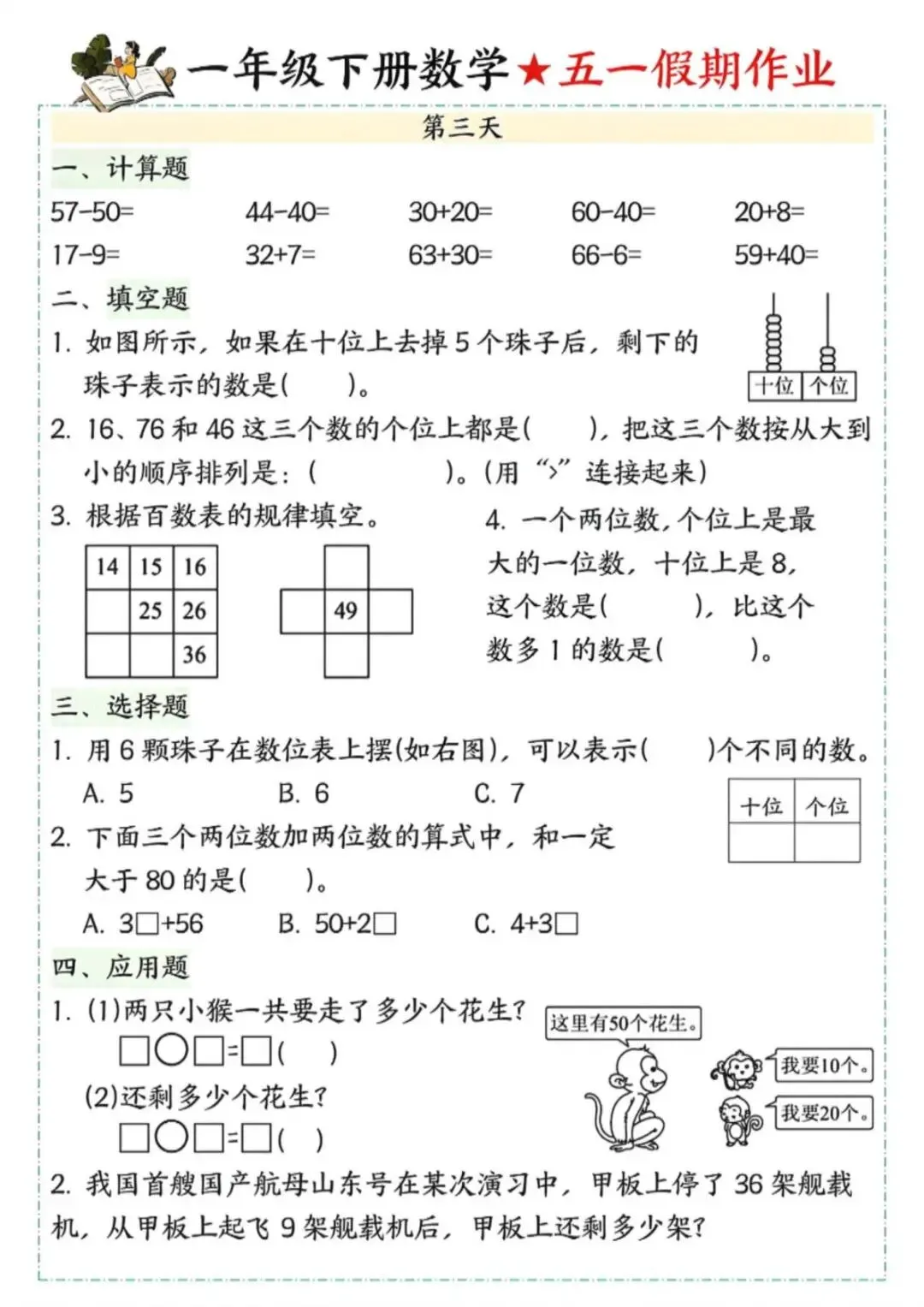 今日课代表给大家分享的是:2026年一年级下册数学五一假期作业,电子版可下载可打印。
