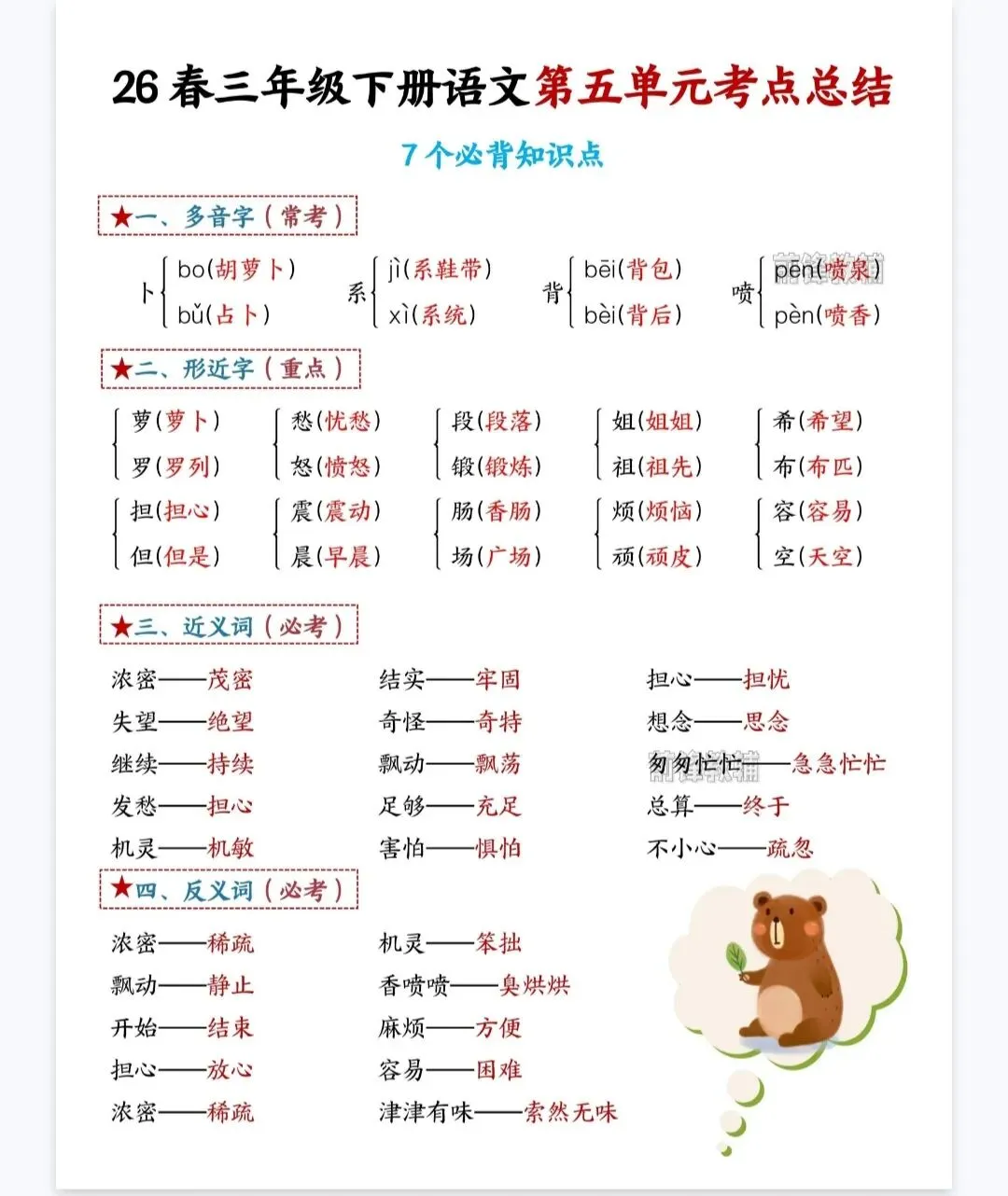 今天给大家整理了2026新三年级下册语文第五单元考点总结+空白,转发给朋友或班级群,受益更多人,帮助孩子学习!
