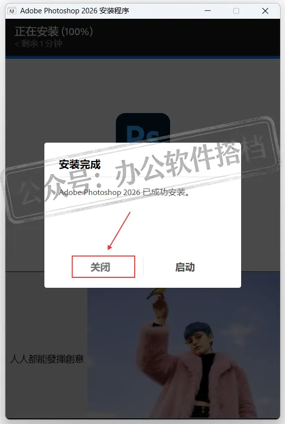5.等到我们安装界面显示Photoshop 2026安装完成后,点击【关闭】。