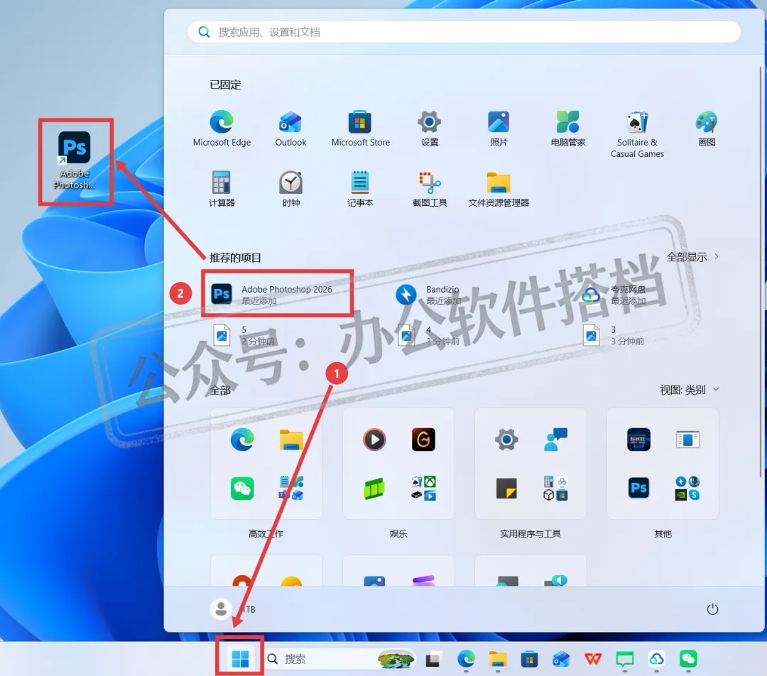 6.安装完成后桌面是没有PS的快捷打开方式,需要我们手动创建一个Photoshop桌面图标:点击电脑桌面的【开始图标】展开,找到刚刚安装的Photoshop 2026程序,按住直接拖到桌面就可以创建完成。