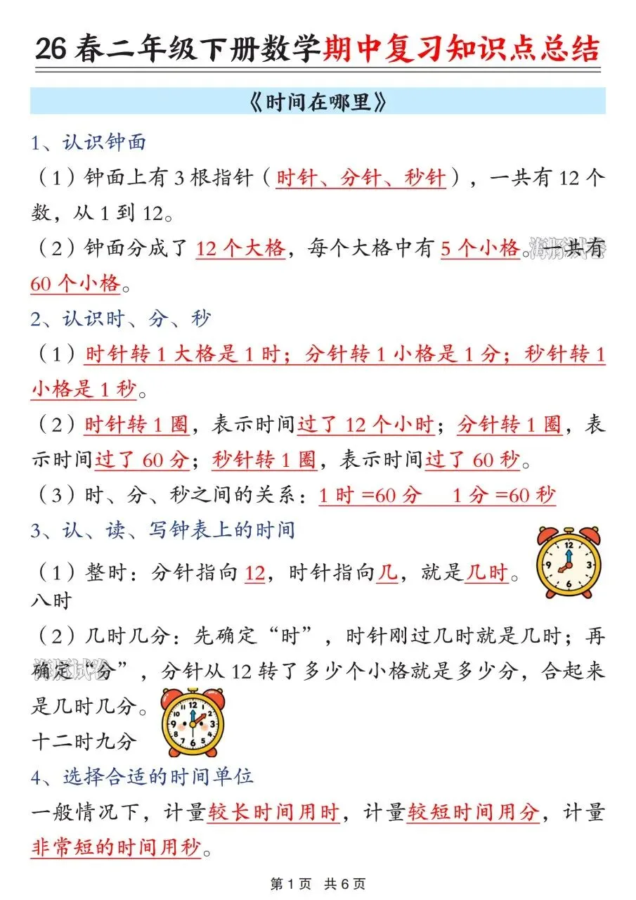 1. 时间:认识钟面与时、分、秒换算与读写;