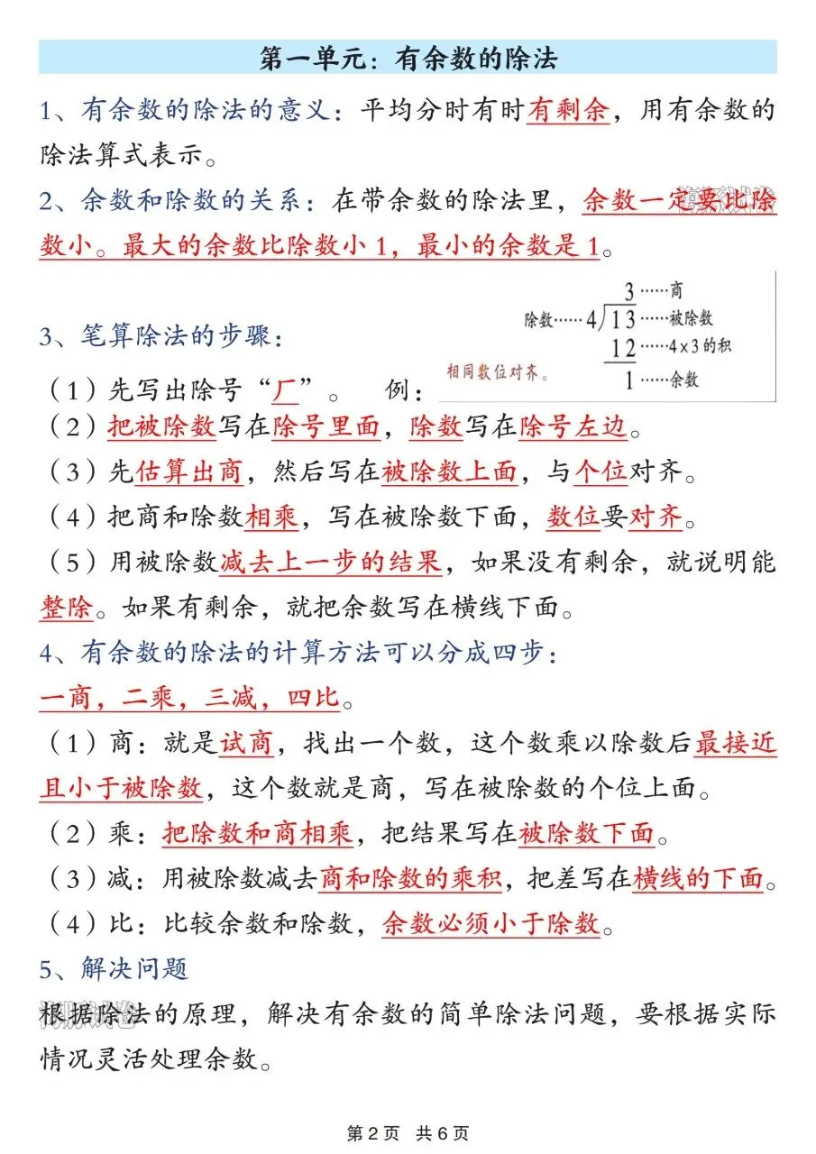 2. 有余数除法:余数<除数,笔算四步(商、乘、减、比)及应用;