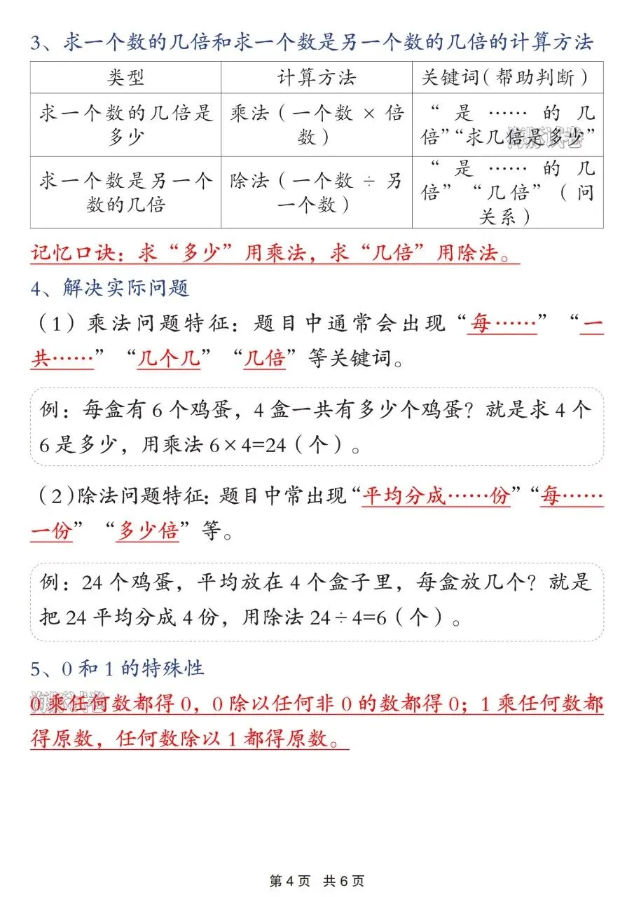 3. 乘除关系:乘法求几个几/几倍,除法平均分/求倍数,0和1的运算特性;