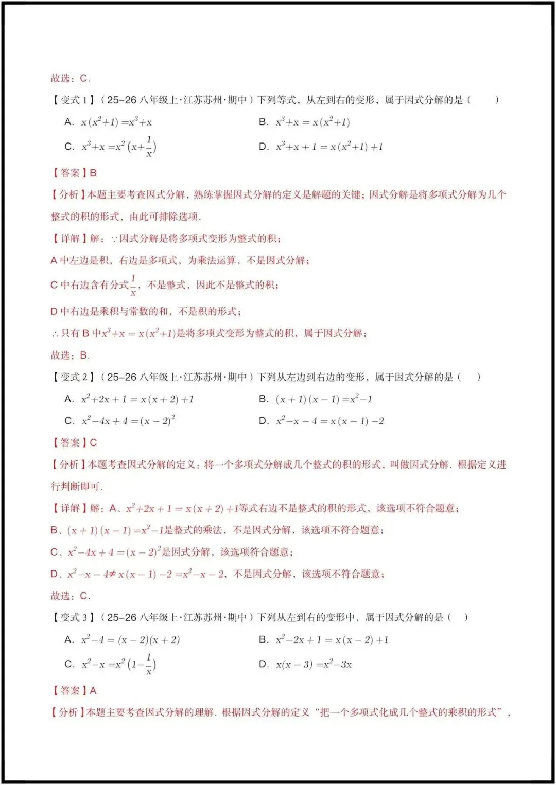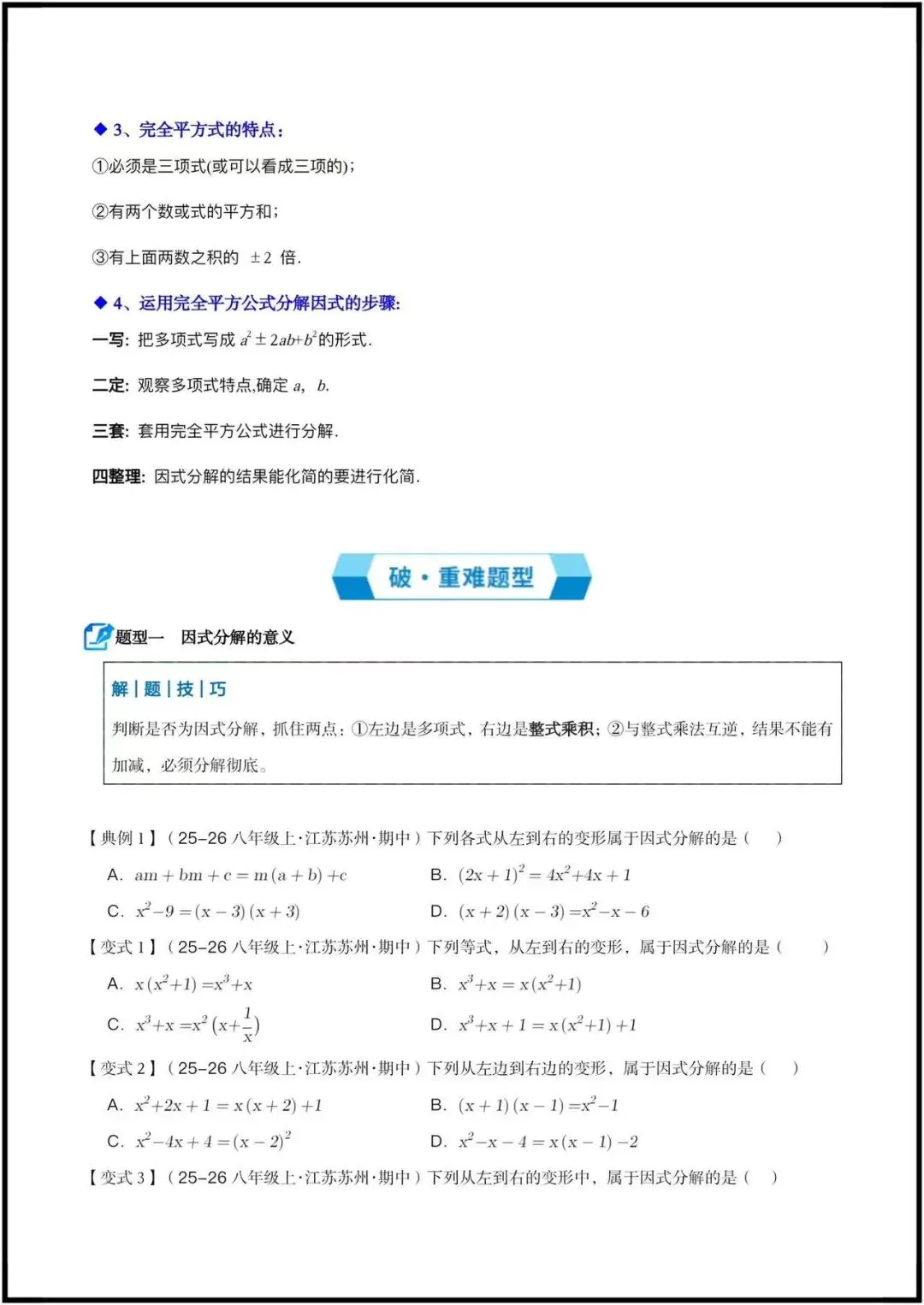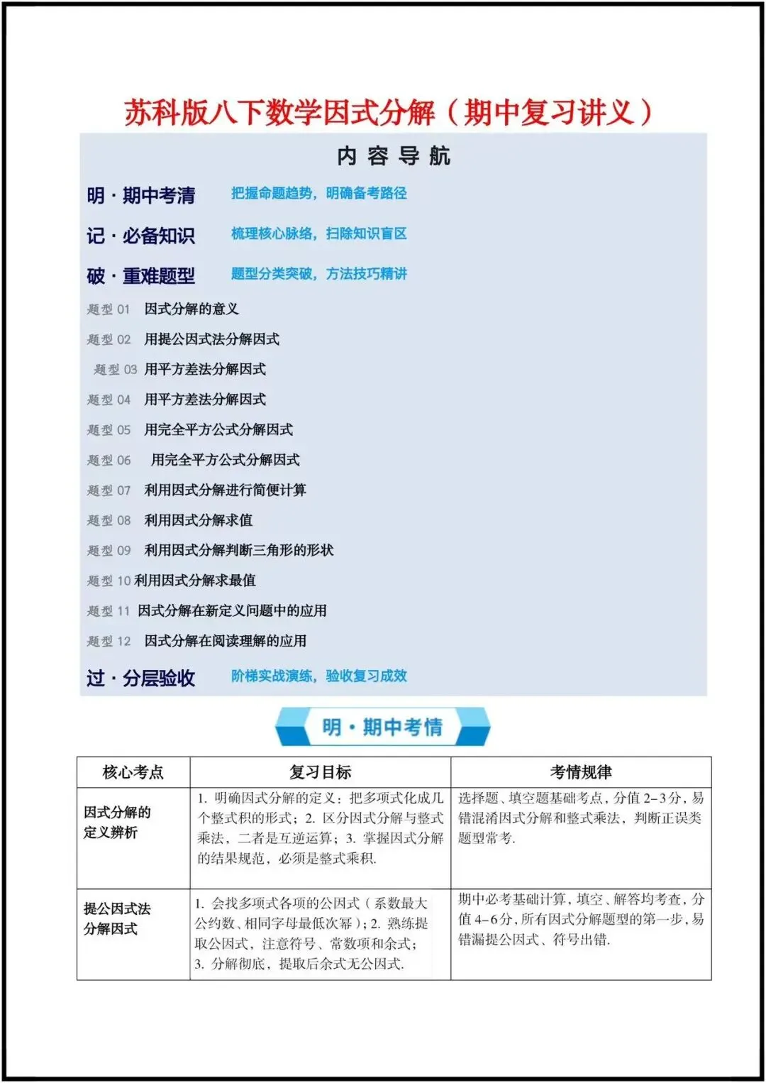 这份资料是苏科版八年级下册数学“因式分解”专题期中复习讲义,专为期中备考打造,是一份“考点梳理+方法精讲+题型突破”的完整复习资料。