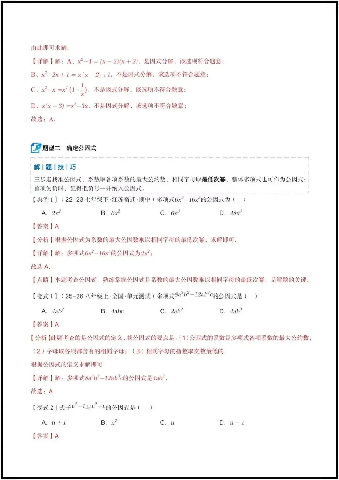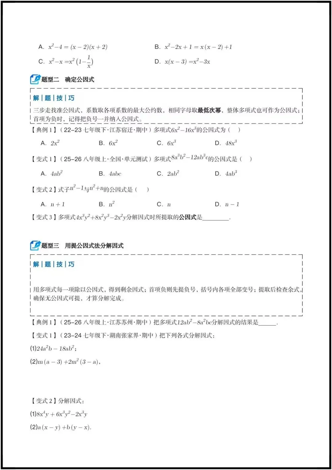 ◦ 基础概念类:因式分解的意义辨析、公因式的确定。