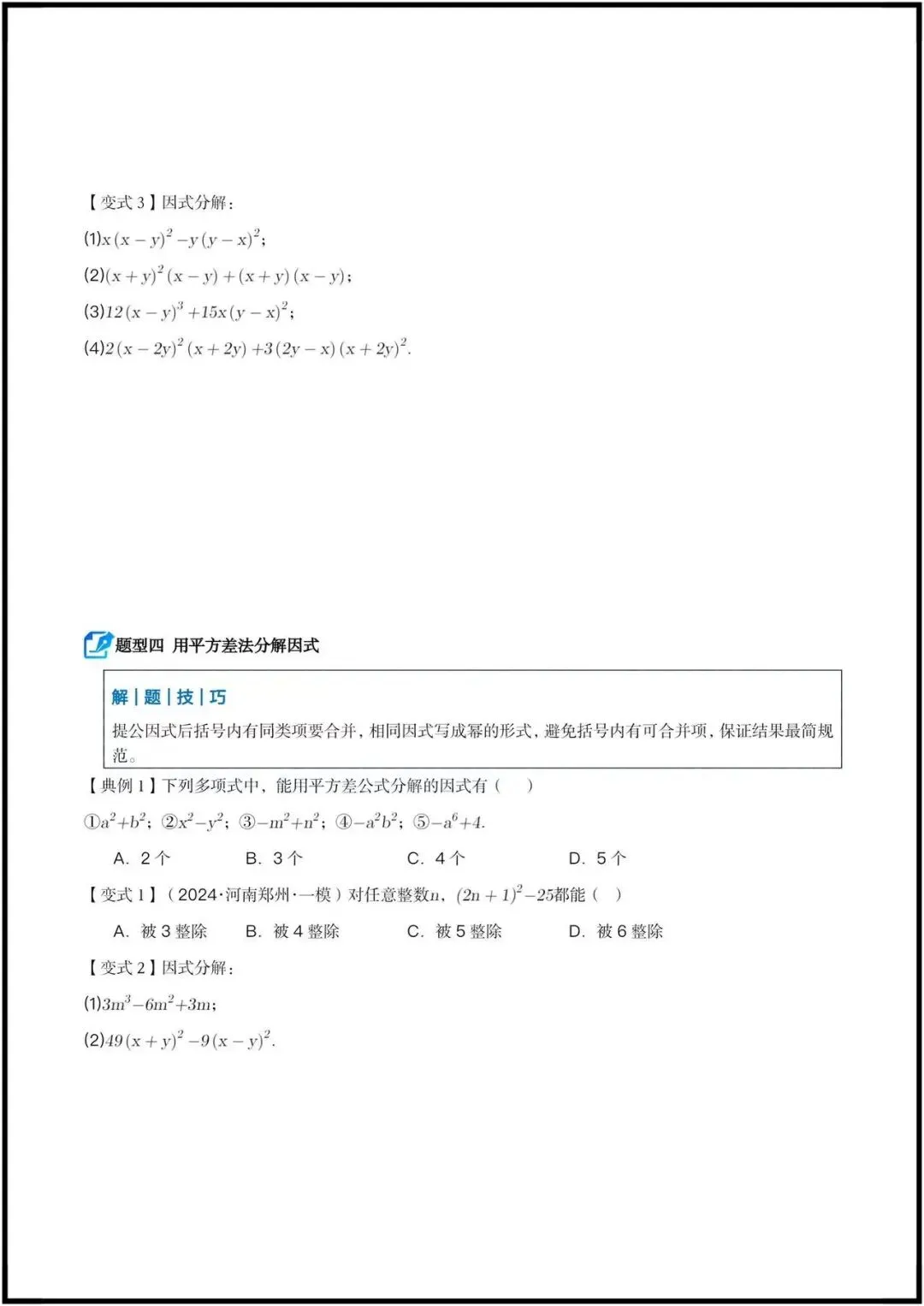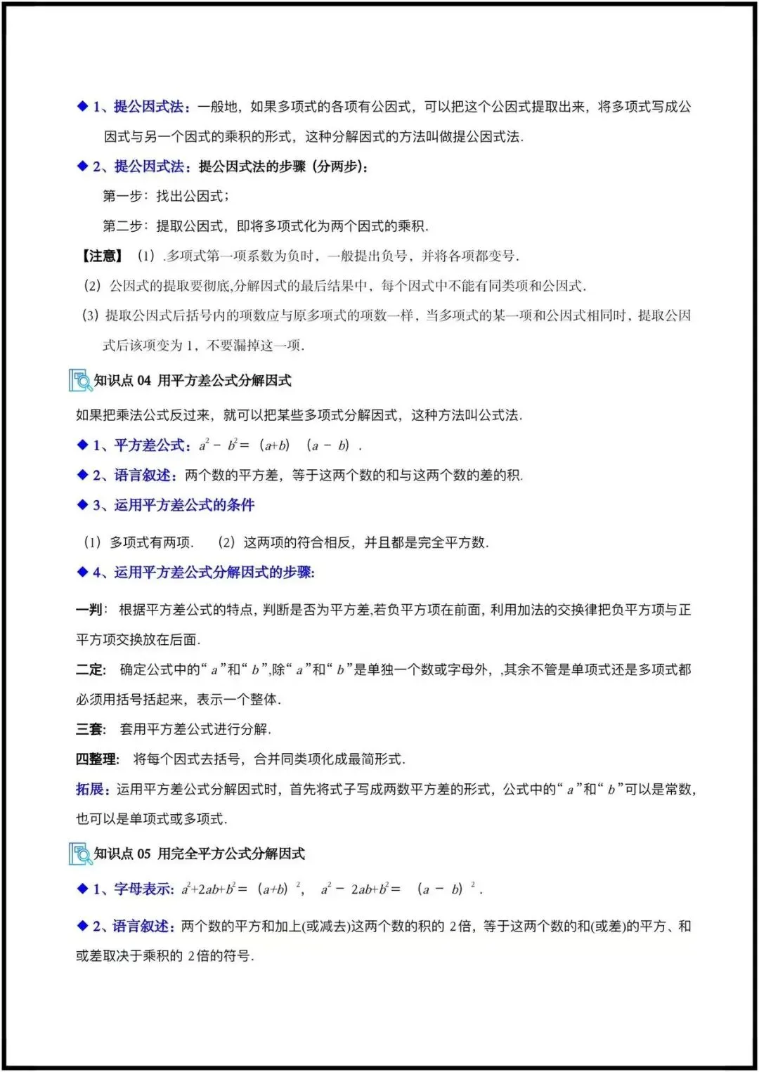 ◦ 公因式的概念与提取步骤(定系数、定字母、定指数)。
